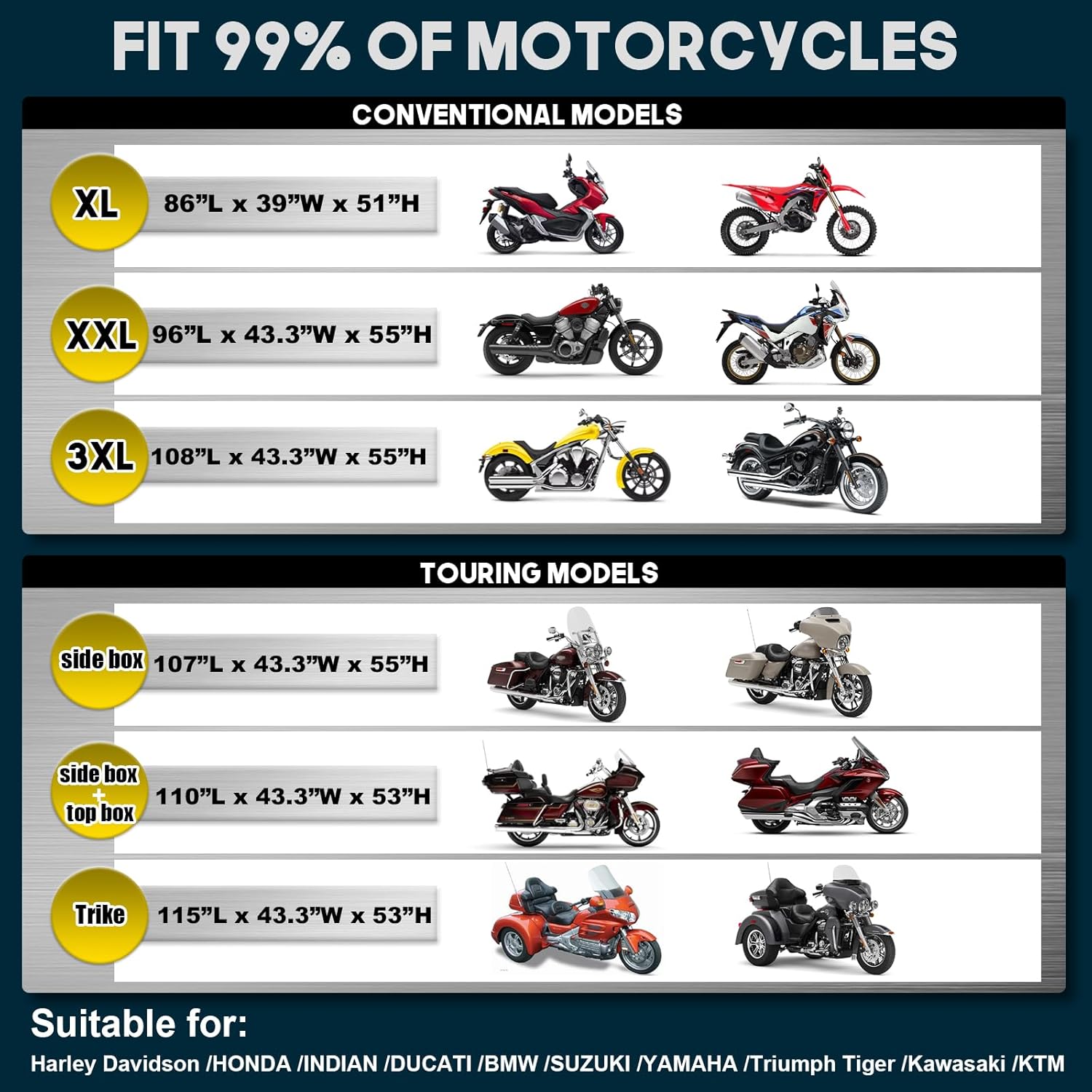 - 🛵【3D CUT】This cover is designed for motorcycle models with side+top box.SIZE: 110"L * 43.3"W * 53"H,Suitable for most motorcycle of touring models,such as Harley Davidson ,HONDA,INDIAN,DUCATI,BMW,SUZUKI,Triumph Tiger,KTM,YAMAHA,KAWASAKI.