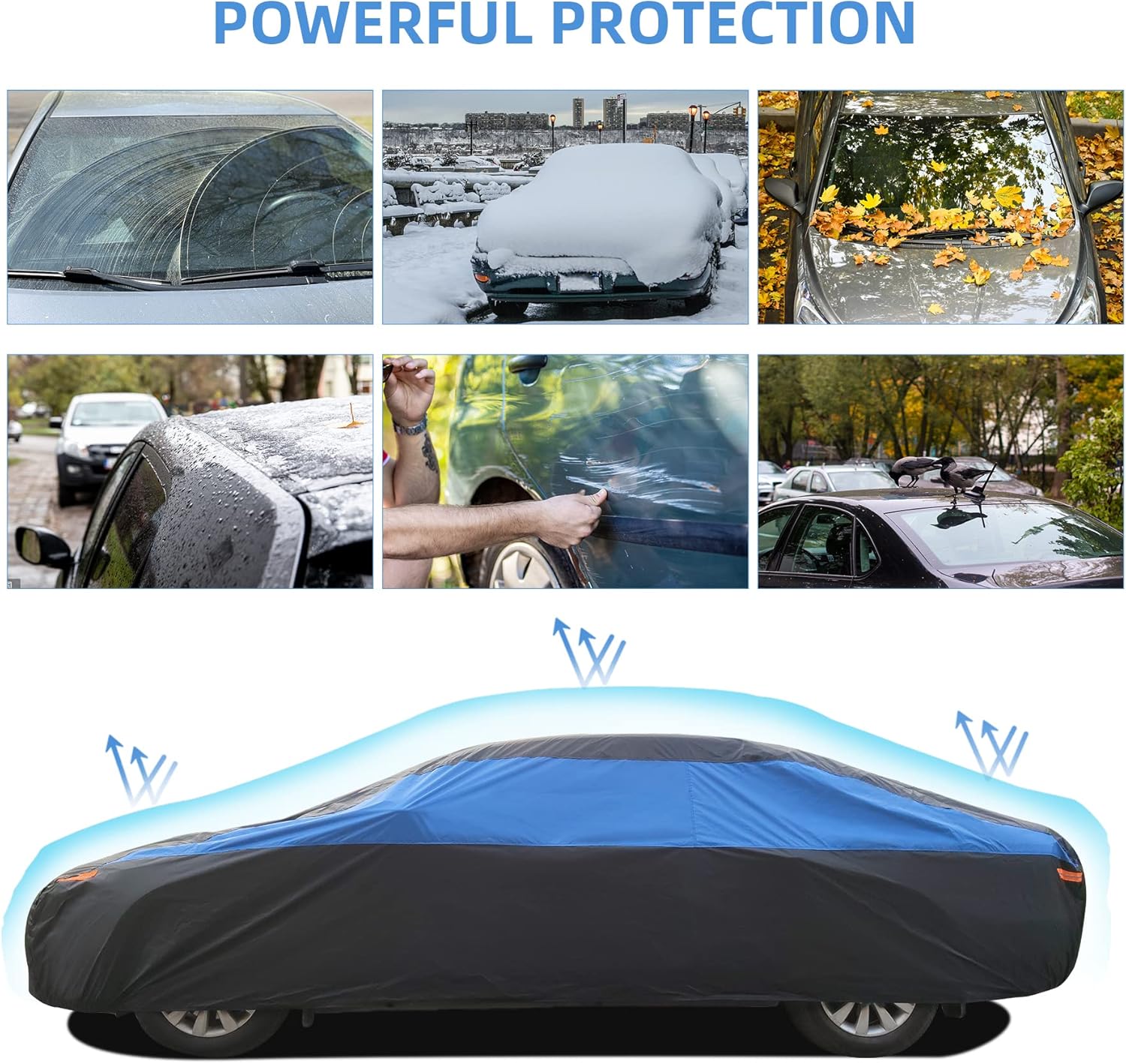 - ăAll weather protectionăThe XicBoom full car cover provides all-round protection for your vehicle against sunlight, UV rays, dust, snow, acid rain and fallen leaves, industrial pollution, bird droppings, pollen, animals and extreme weather. Easy to clean, just wipe with a damp towel to remove contaminants from the surface of the cover.