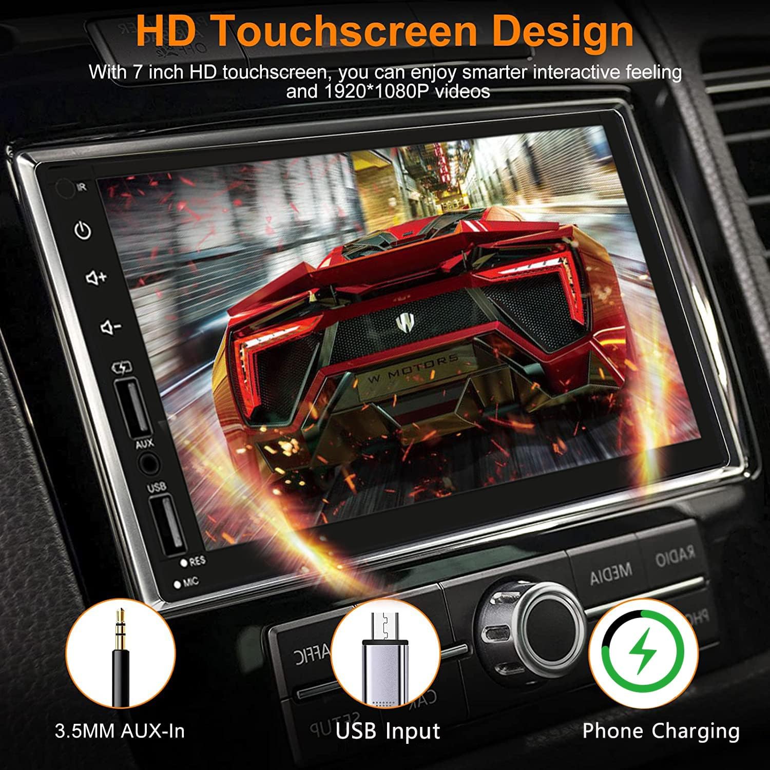 - šćWired Mirror Link for Phone & HD Full TouchscreenćConnect your smartphone to your device via a USB data cable, easily connect and sync any content(such as video, music, GPS navigation, etc.) to the car MP5 player displayed on a large screen. And bluetooth car radio touchscreen is equipped with 7 inch high definition 1024x600 capacitive touch screen,supports 1920x1080P video playback for more sensitive and accurate operation.