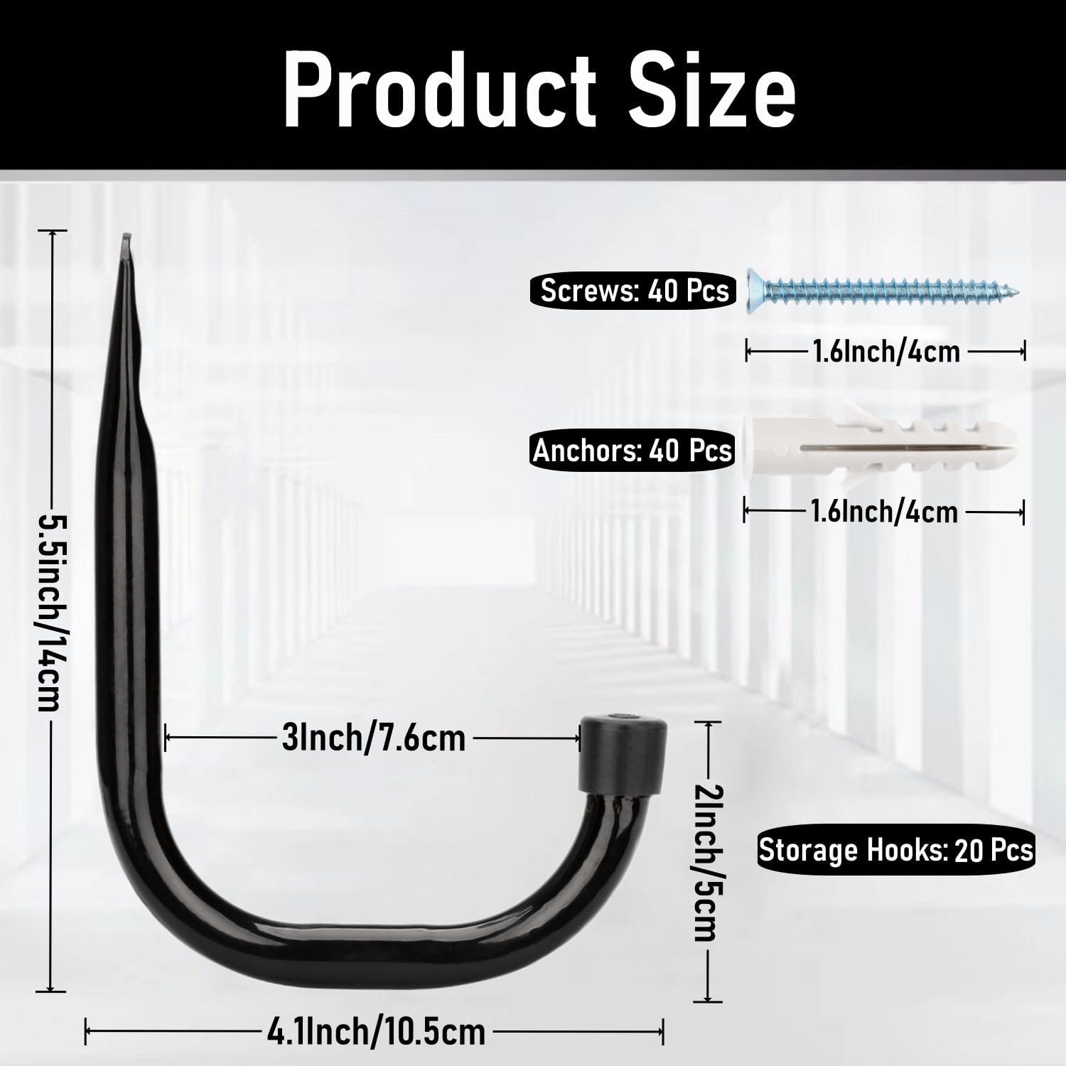 - SIZE & CAPACITY: 20 pcs garage hooks size is 5.5Inch x 4.1Inch(H x L), with 40 screws and 40 anchors, enough hooks and accessories to meet your daily use and installation requirements, which are very practical household storage tools.