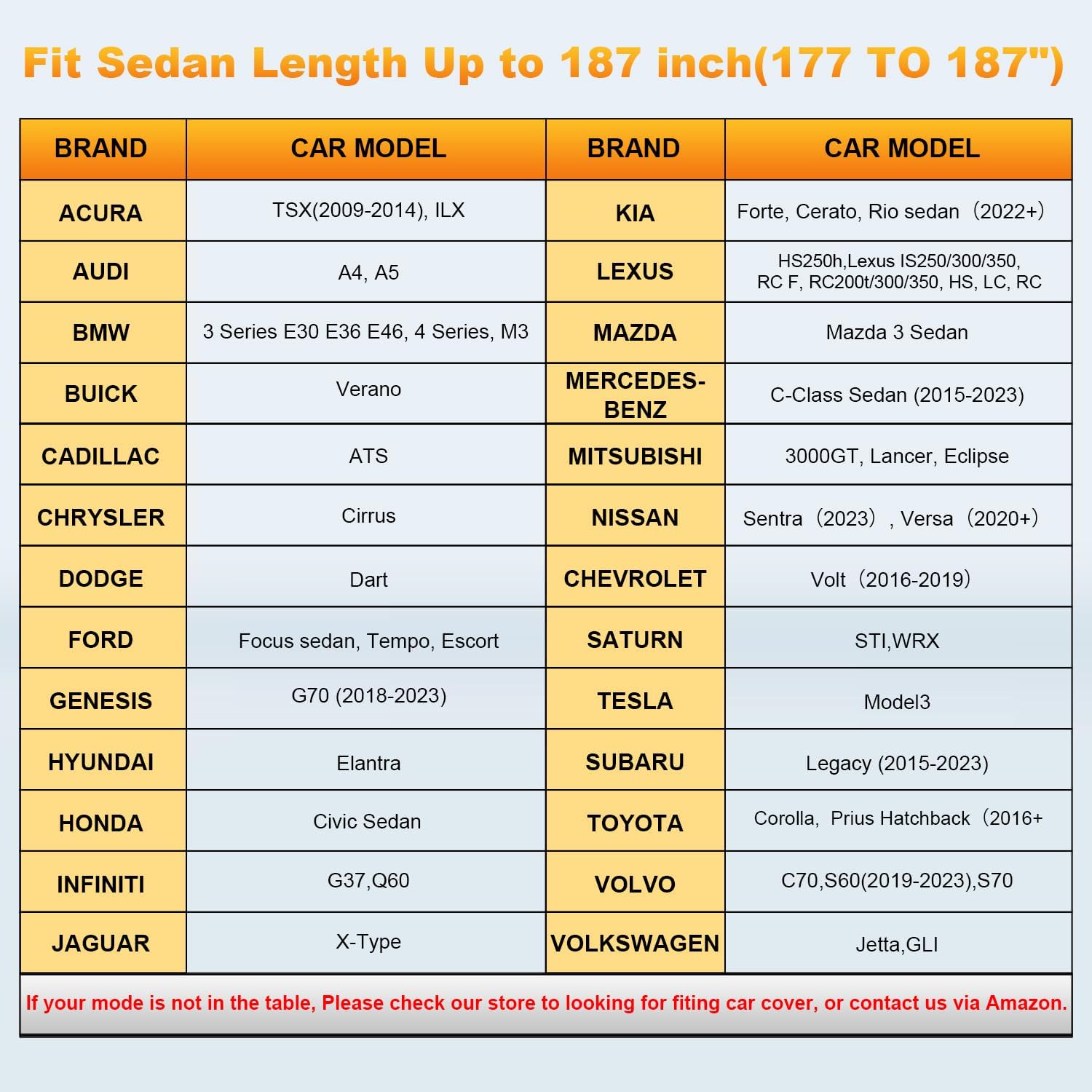 - Universal Fit for Sedan: Car cover SIZE: 475X180X150cm/187''x71''x59''inch, fit most sedan. Please Measure Your Car's Length First. Elastic pendulum and buckle can be adjusted freely. Come With A Large Enough Portable Storage Bag To Keep Your covertor para carro contra agua