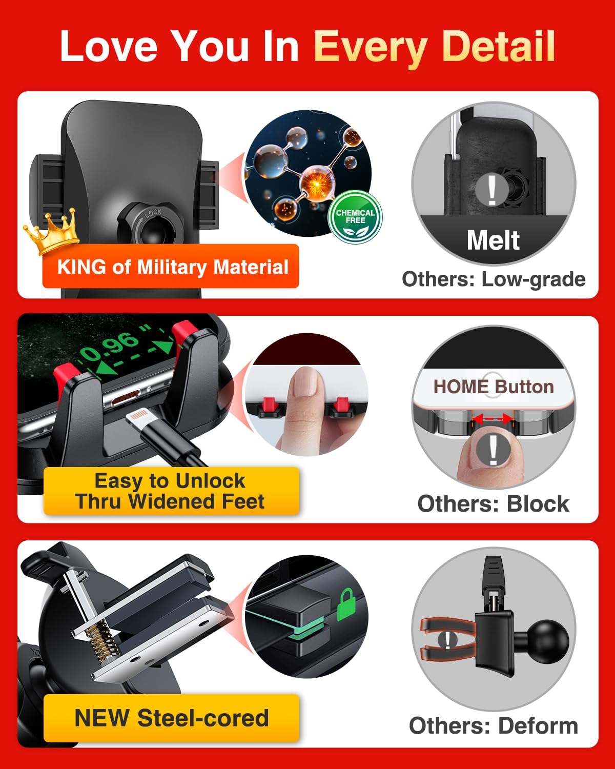 - 【🎁Luxury Gift: Top-notch Configuration&Master Designed Package】Exquisite cell phone holder comes with suction mount & vent clip Combo. The unit is extremely flexible! Dashboard, Windshield, Air Vent, all places work perfectly! All Well-packaged in a Reliable, Elegant & Eco-friendly box. Package includes phone mount *1, Suction Cup*1, Vent Clip*1