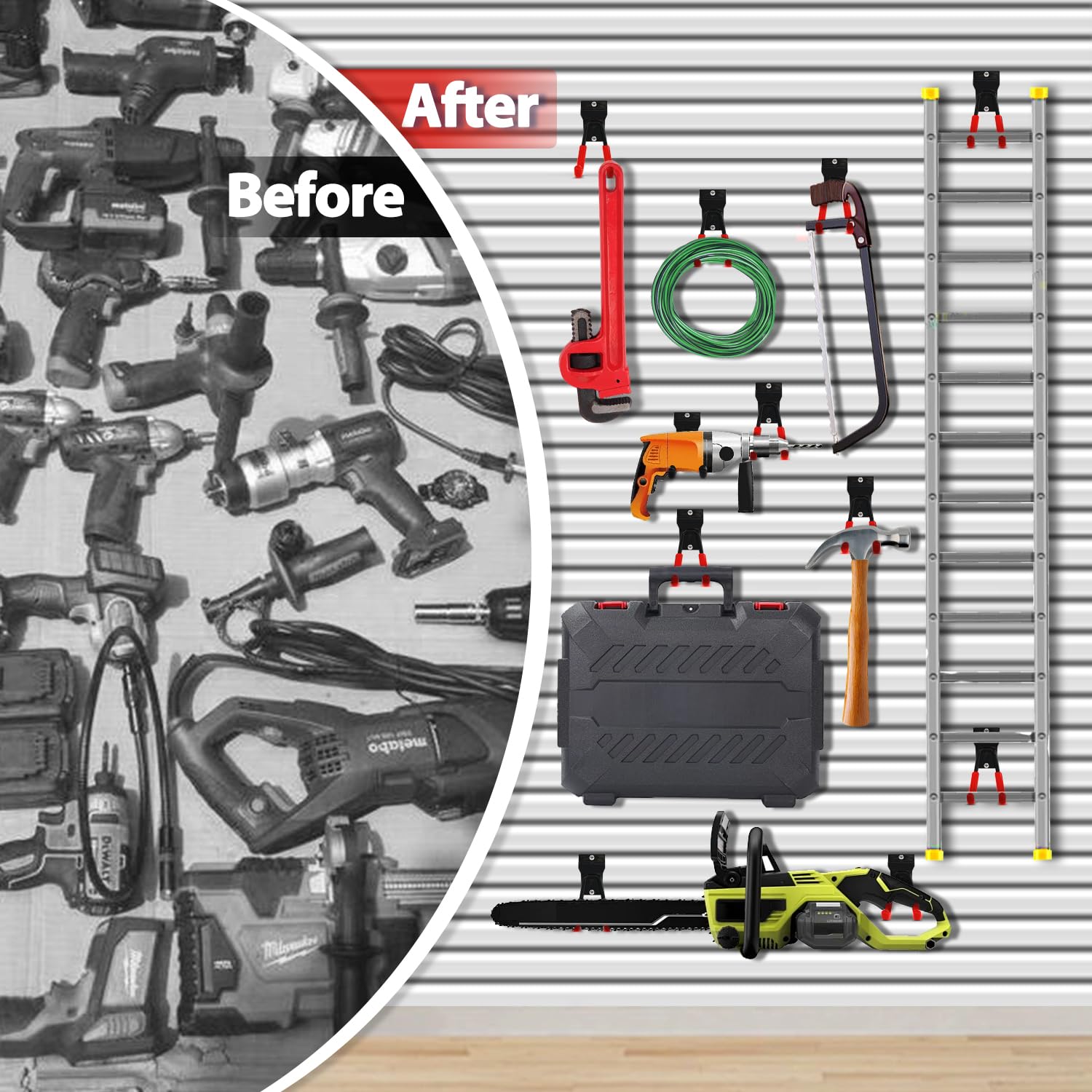 - Multi Sizes Slat Wall Hooks: 18 pcs slat wall accessories in 7 different sizes 2 extension cord organizers, including 2 large wave hooks,2 large square hooks, 2 medium square hooks, 4 small square proslat hooks, 2 media J hooks and 4 small J hooks which can accommodate different types of garden tools and equipments