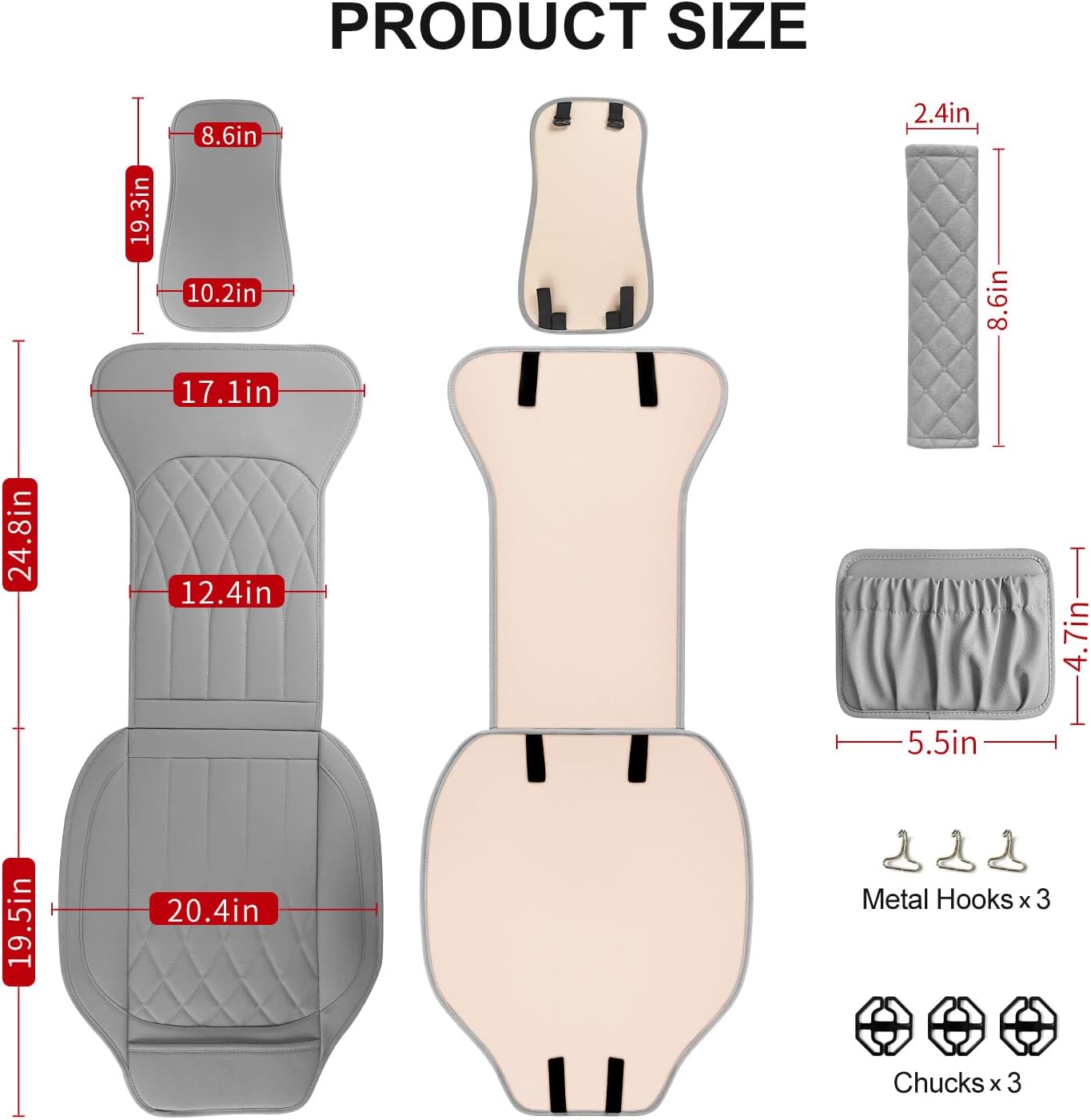 • Package Includes:car seat cover*1, car pocket organizer*1,car seat belt pad*1,metal hook*3, chuck*3,installation manual * 1.Please contact us if you have any questions about the product, and we will reply you within 24 hours.