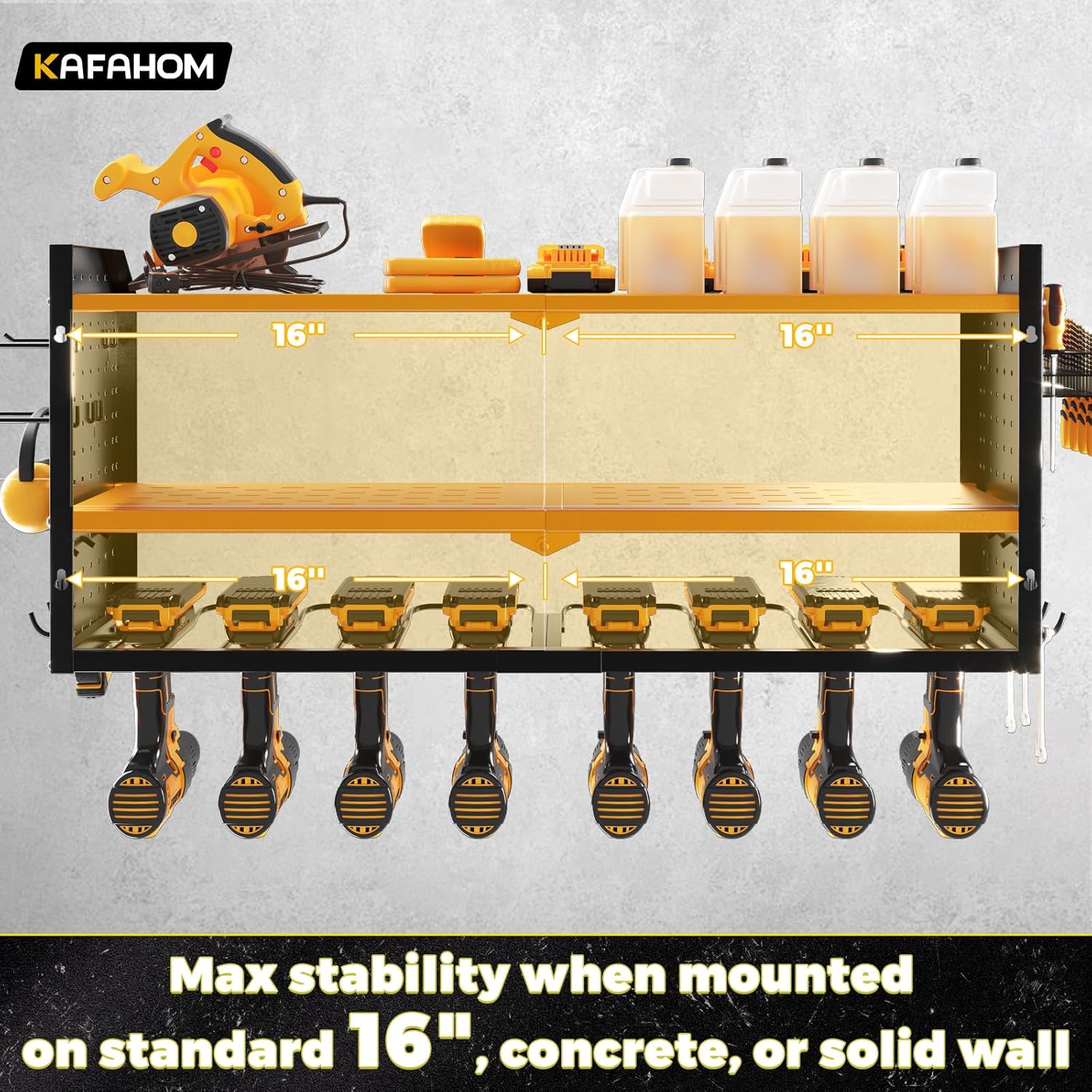 - STRUCTURAL OPTIMIZATION: The KAFAHOM top-of-the-line garage organization rack features a revolutionary structure design that provides exceptional stability and increased weight capacity for your power tools. Thanks to the optimized structural design and aspect ratio - not only is it can perfect for the 16" wall studs, but the utility cordless drill holder can be mounted on concrete, drywall, pegboard. Plus, the lower part can hold up to 8 heavy power tools.