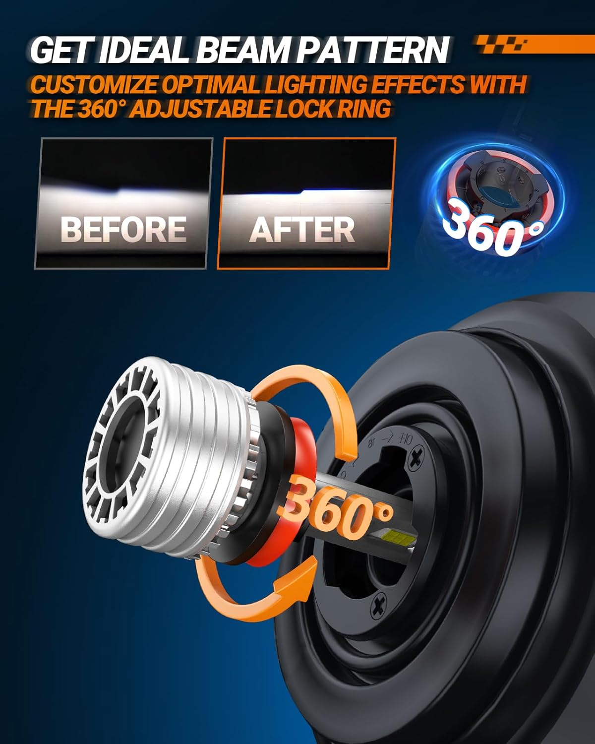 - 1:1 Size: With 360° adjustable lock ring, H11 bulbs ensure focus light ensures higher on the passenger side to illuminate road signs and lower on the driver's side to prevent blinding other drivers, making night driving safety