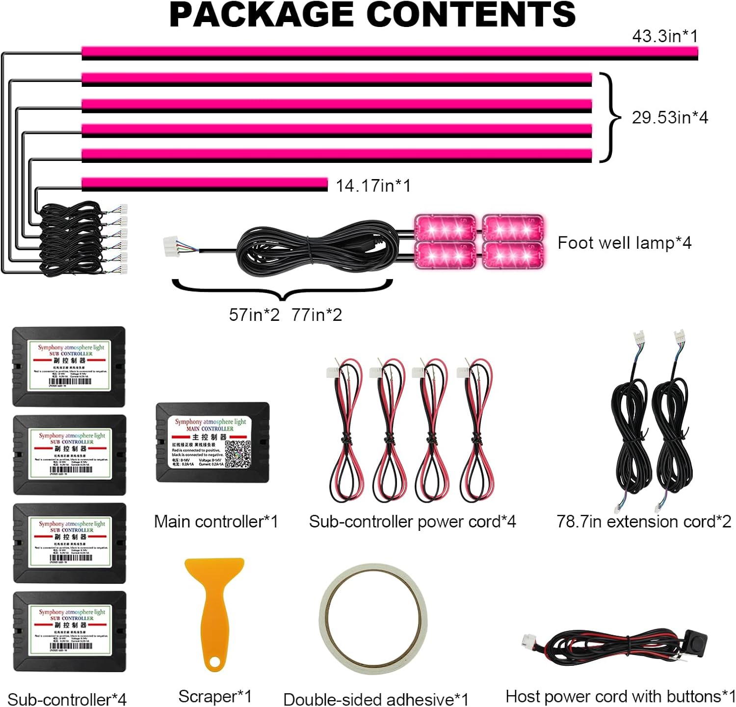 - 🚚Car Ambient Light Design: AMKI car led lights includes 6 acrylic fiber optic light strip(4*29.5inch+1*43.3inch+1*14inch), and 4 car interior foot well lights(51inch*2/66inch*2), one master controller and 4 sub controller,all required installation tools are included, easy to install.Just put the fiber optic light strip into the gap in the car, hidden the line of car foot light under the car mat, without worrying about exposed wiring or an untidy look.