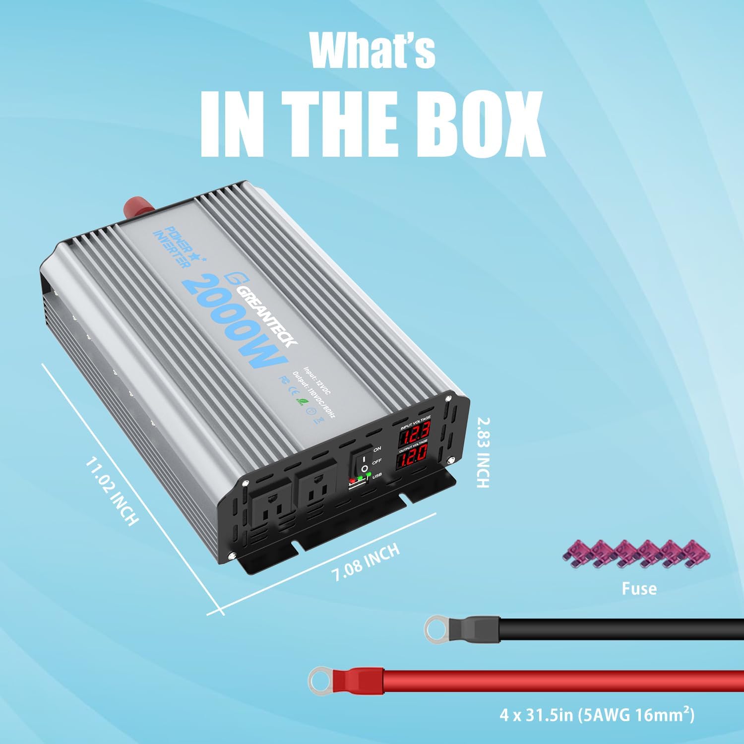 - [24 MONTHS WARRANTY & FULL SET] GREANTECK team offers 24 months warranty. Package includes 1x 2000W Modified Sine Wave Inverter , 1x User Manual, 2x Battery Cables, 6x Fuses. We provide 24/7 customer service. Please contact us by email if you have any question.