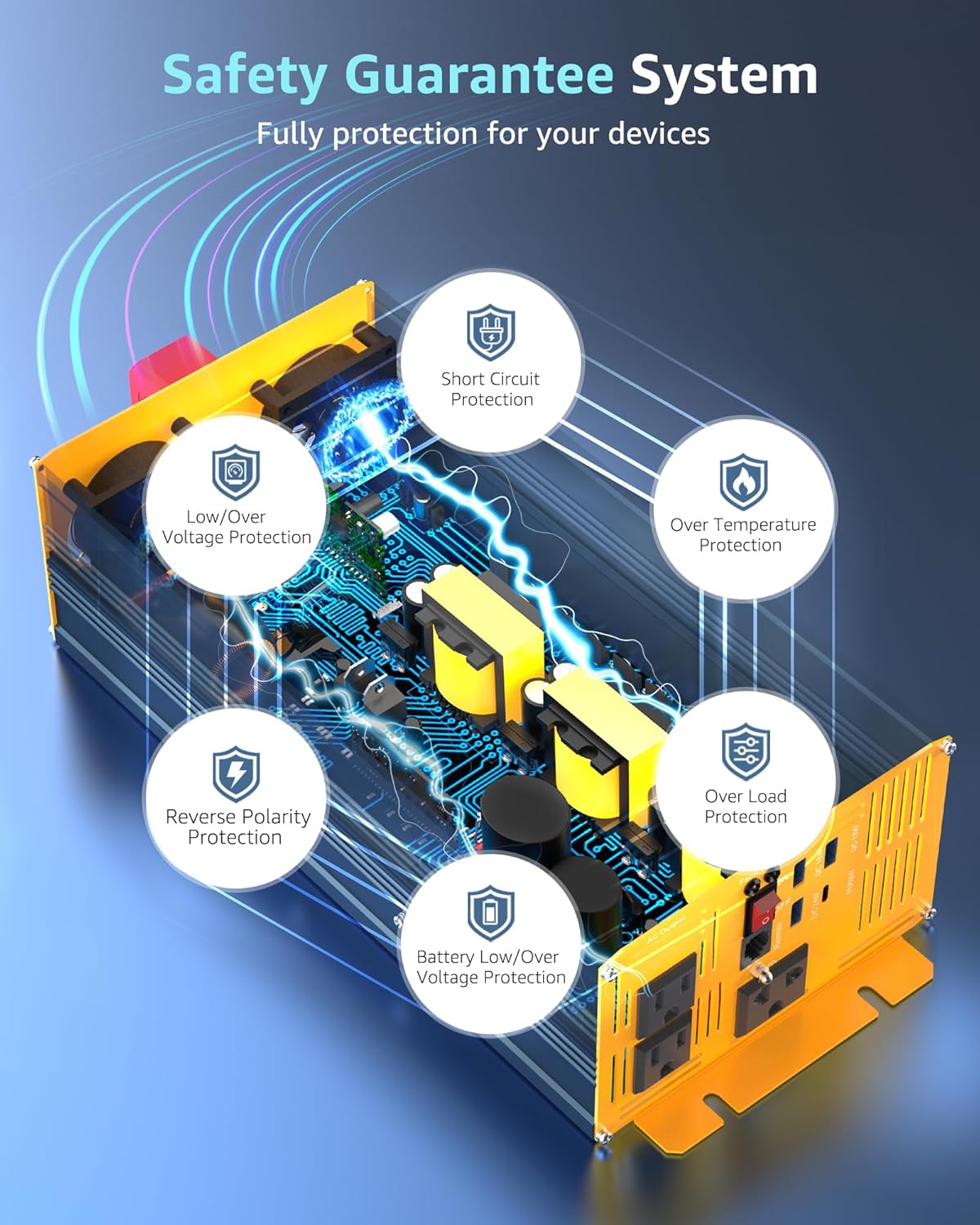- 【FULLY SAFETY PROTECTIONS】 Pure sine wave inverter has passed FCC CE ROHS PSE certification. Designed with isolated input/output stable design offers under-voltage protection, overvoltage protection, overload protection, overheating protection, and short circuit protection to ensure safety.