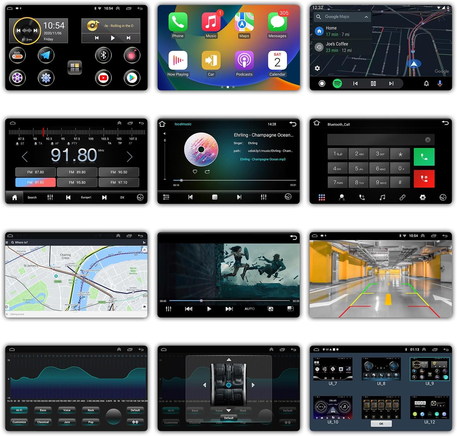 - 【Connection and Control】Support CarPlay+Android Auto+USB+Bluetooth+WiFi. Connect Bluetooth to make hands-free calls, play music, save contacts and playlists. Connect Wi-Fi to access the Internet. Support external steering wheel remote control(SWC)