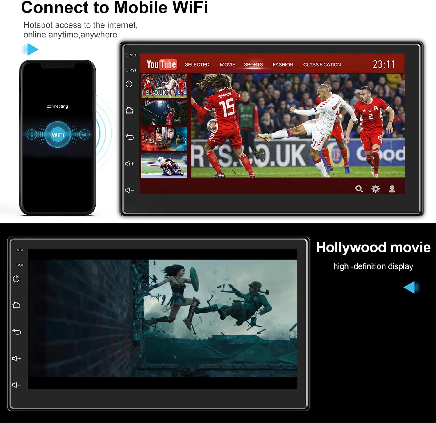 - 【7.0 inch HD 1080P IPS touch screen and Mirrorlink】7 inch HD 1080P IPS touch screen. Mirrorlink allows you to project your phone's display onto a screen. Scratch-proof IPS tempered glass touchscreen with 2.5D curved edge, high sensitivity, high definition and high transparency. You can connect the reversing camera to view high-definition reversing video and watch high-definition movies, YouTube, etc.