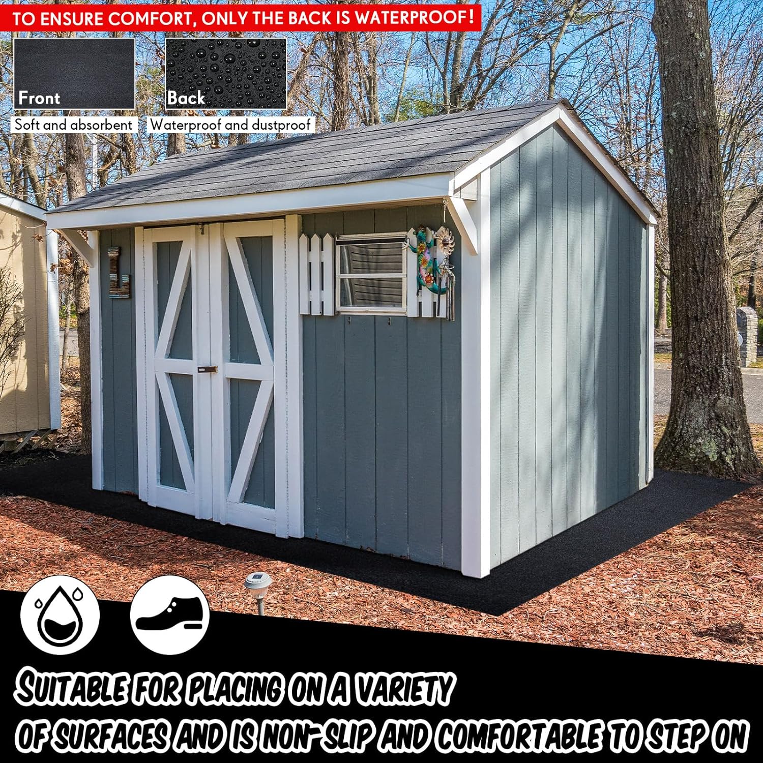 - Easy to Install: the outdoor storage shed mat is simple to use, you just need to unfold the mat and place it flat under the outdoor storage shed floor, which can protect your outdoor storage shed floor from wearing and tearing; Non slip backing remains on the floor for added cushioning, and you can also cut it into proper size to meet your needs