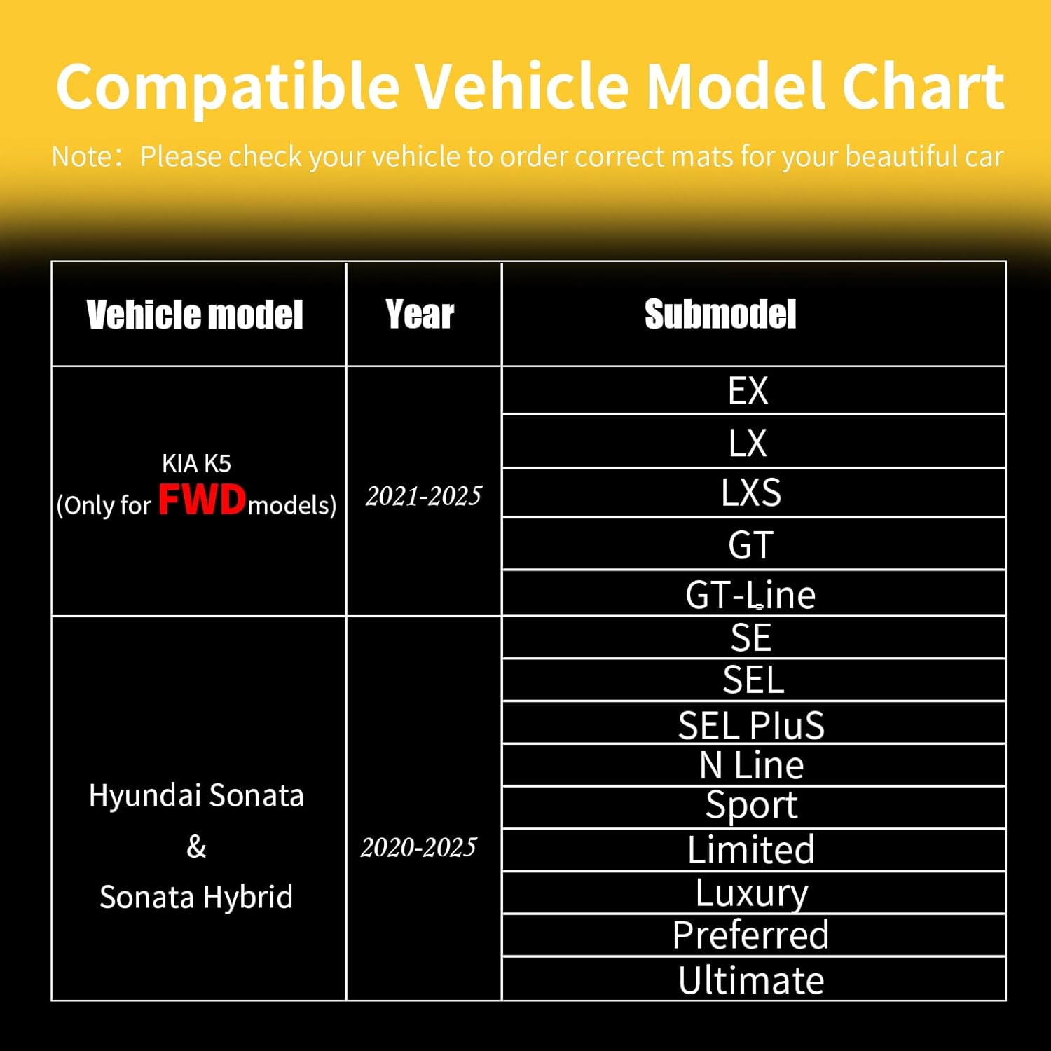 - Which models are compatible? Fit for Kia K5 2021 2022 2023 2024 2025 (Only FWD Models) EX | LX | LXS | GT |GT-Line & Fit for Hyundai Sonata/Sonata Hybrid 2020-2025