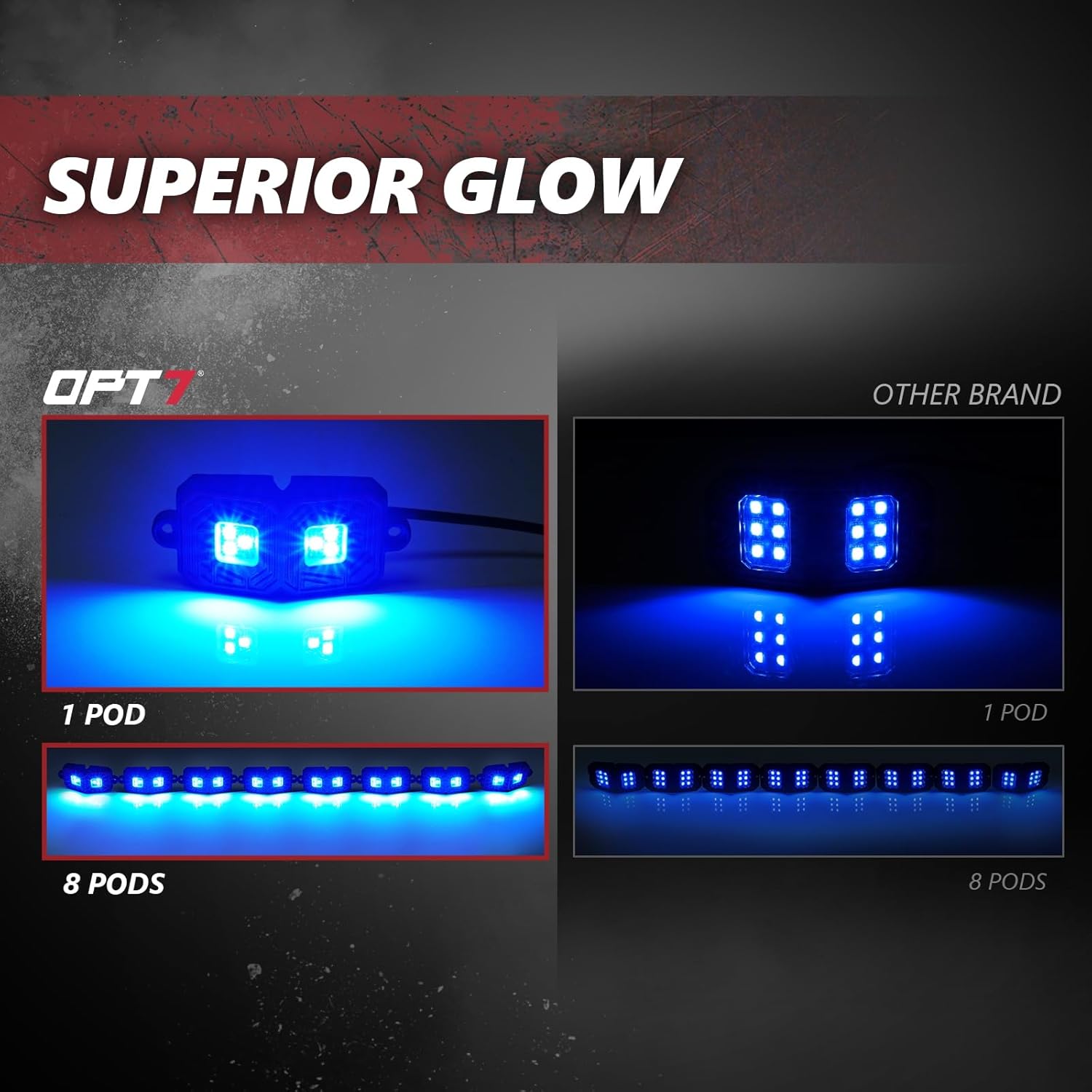- [2 CONTROL METHODS] Customize your lighting with a wide array of colors and modes using the app and remote control. Choose from limitless static RGB colors, select various modes, and adjust speed, flashing, and brightness. Easily turn your LED rock lights on and off, enhancing your vehicle's style, functionality, and adventurous spirit. Simply scan the user manual or the QR code on the control box to download the OPT7 GLOW app, available for both iOS and Android. App name: OPT7 GLOW