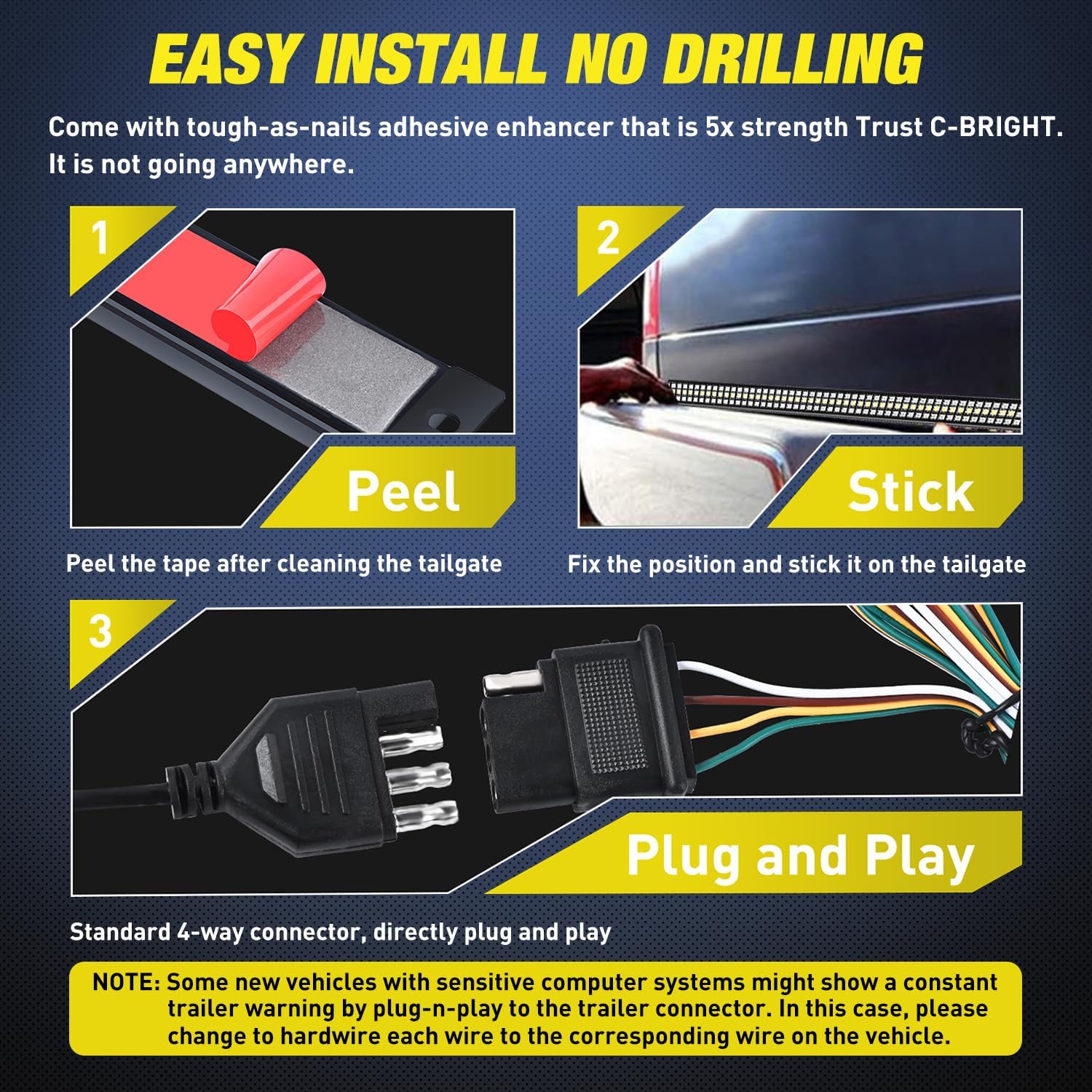 - Widely applicable: this tailgate Light Strip is 60 inches long and is suitable for most pickups, trailers, truck, towing vehicle, cars, SUV, RV, Van, etc. NOTE: If there is a warning when plugging into the trailer port, please connect the car light wiring follow the line sequence