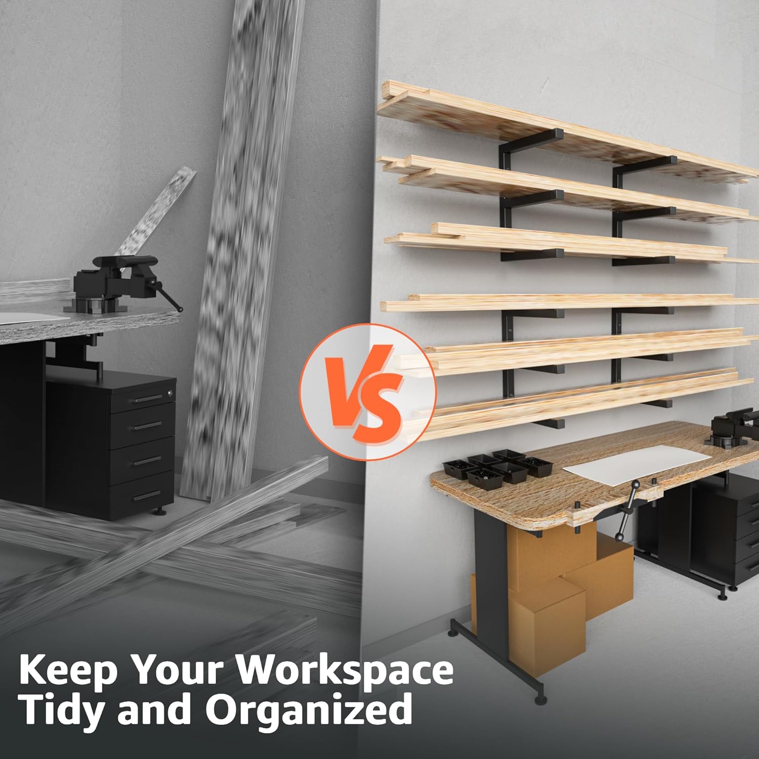 - 【Weight Capacity of 1200 LBS】YYR lumber storage rack wall mounted is made of powder-coated 1⅙” (3 cm) steel tube construction。After many tests, each shelf can hold up to 200 lbs, which means a total weight capacity of 1200 lbs.