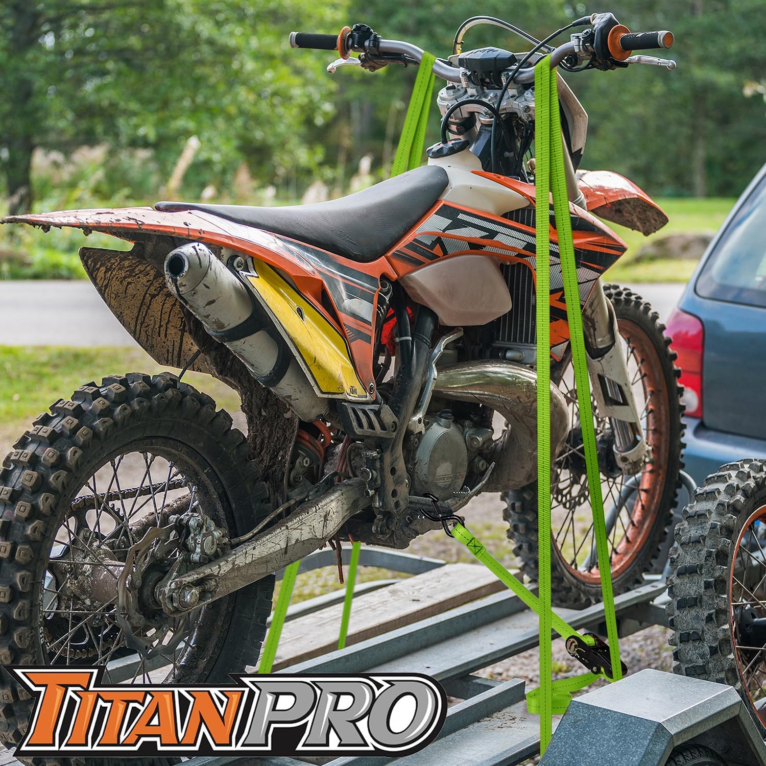 - VERSATILE APPLICATIONS: From motorcycle ramps to side-by-side accessories and tow truck equipment, TitanPro Ratchet Tie Down Straps are the go-to choice for securing cargo, offering flexibility, strength, and reliability for all your tie-down needs.