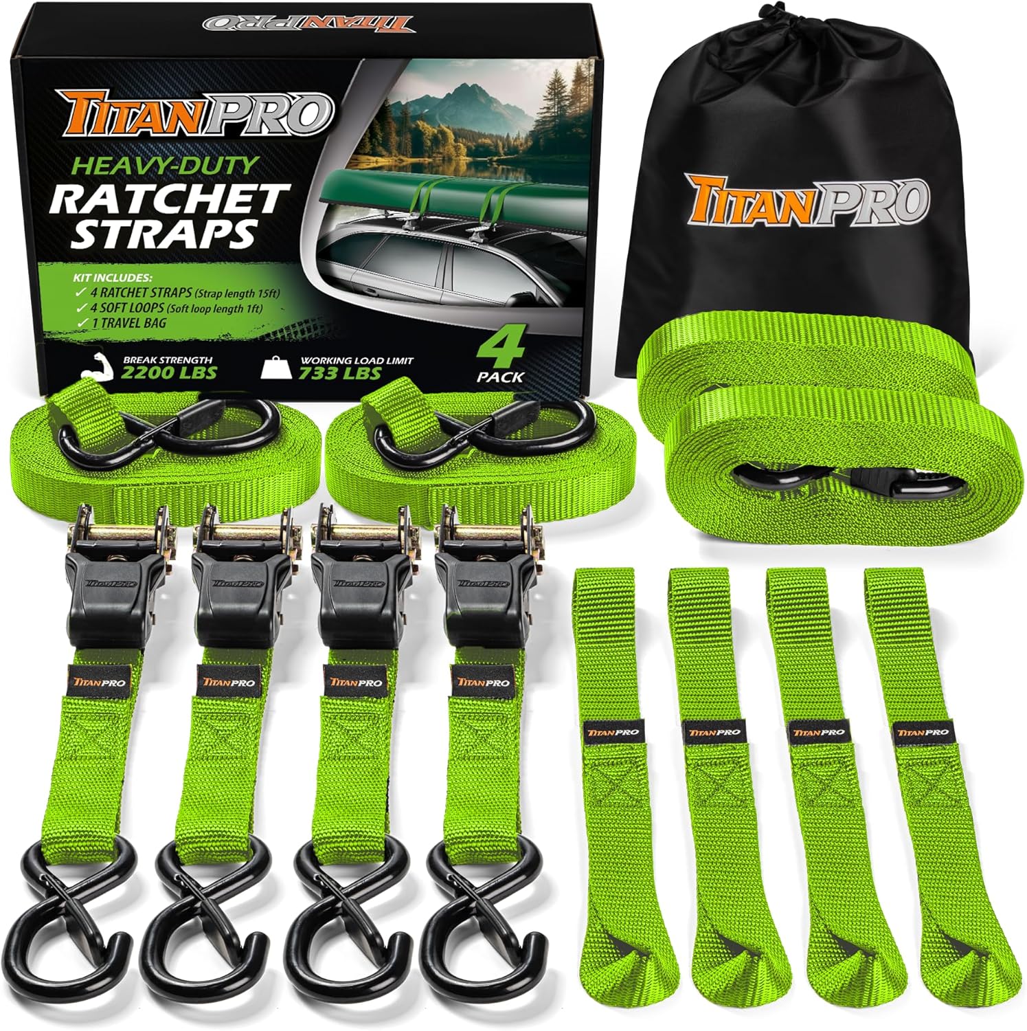TitanPro Heavy Duty Ratchet Straps 4-Pack - 2,200lb Break Strength, 1" x 15' Rachet Tie Downs with Padded Handles - Heavy Duty, Truck, Motorcycle, Moving Straps (Green)