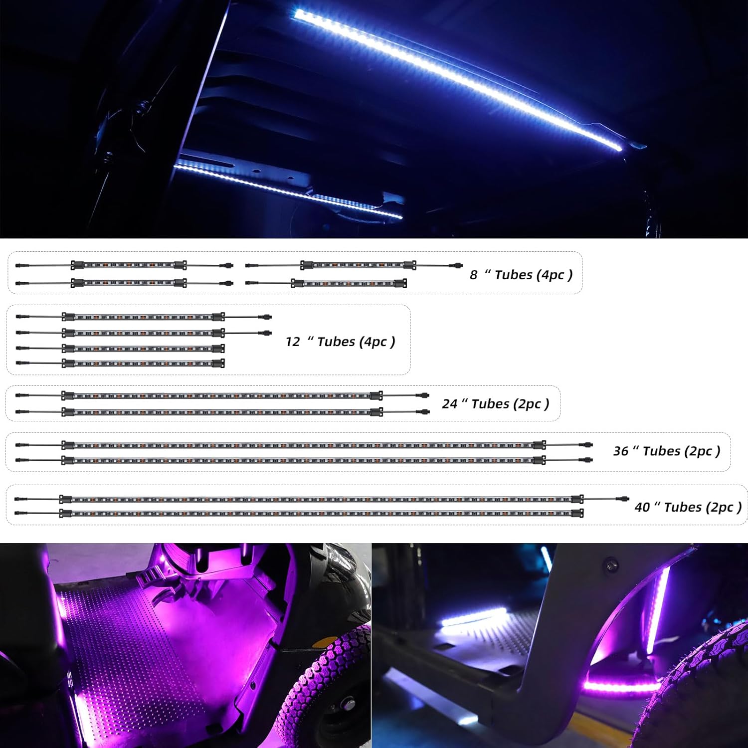 - APP & Remote Control: The golf cart LED light strip kit supports remote control and APP bluetooth control. They can all be used to adjust colors, brightness and flickers speed.