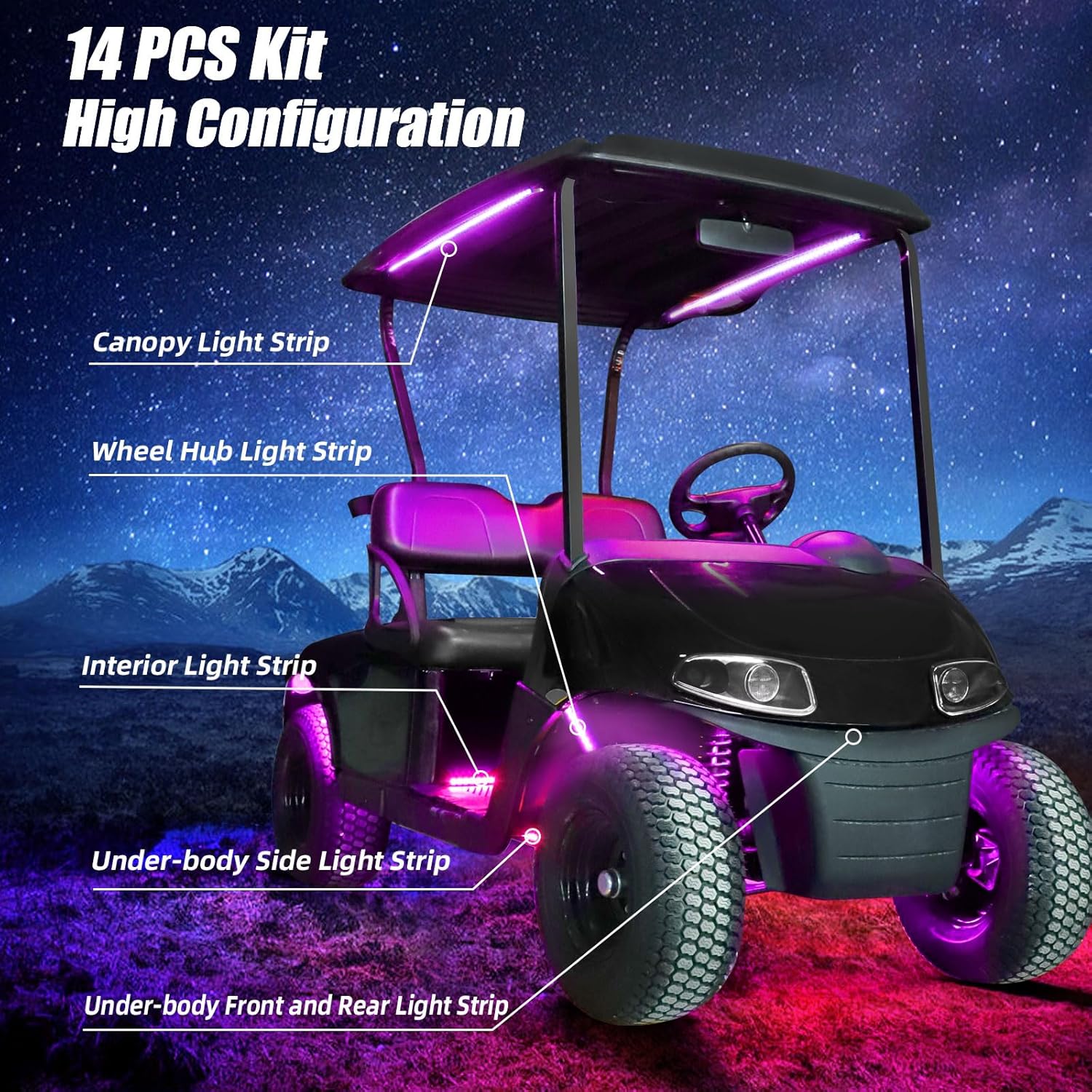 Roykaw Golf Cart Underglow LED Strip Lights Accent Neon Lighting Kit w/Canopy, Wheel Well & Interior Lights for EZGO Yamaha Club Car, Million Colors/Waterproof IP68/Sync to Music, Fits 12V-80V, 14PCS