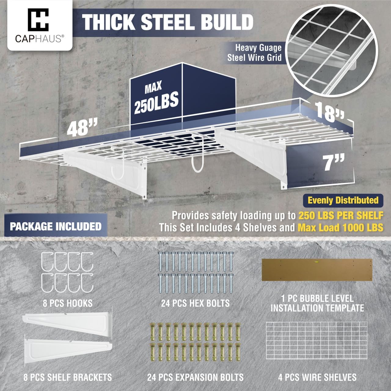- šØ Various Size Choices - This option includes FOUR wall shelves, EIGHT Versatile hooks, and all necessary hardware. Each shelf measures 48 inches in width and 18 inches in depth, providing a total of 192 inches in width. Opt for the silver hex bolt for concrete and wooden walls and choose the golden expansion bolt for secure installation on brick walls. Heavy gauge steel construction provides safety loading up to 250lbs total per shelf, this set providing a total weight capacity of 1000 lbs.