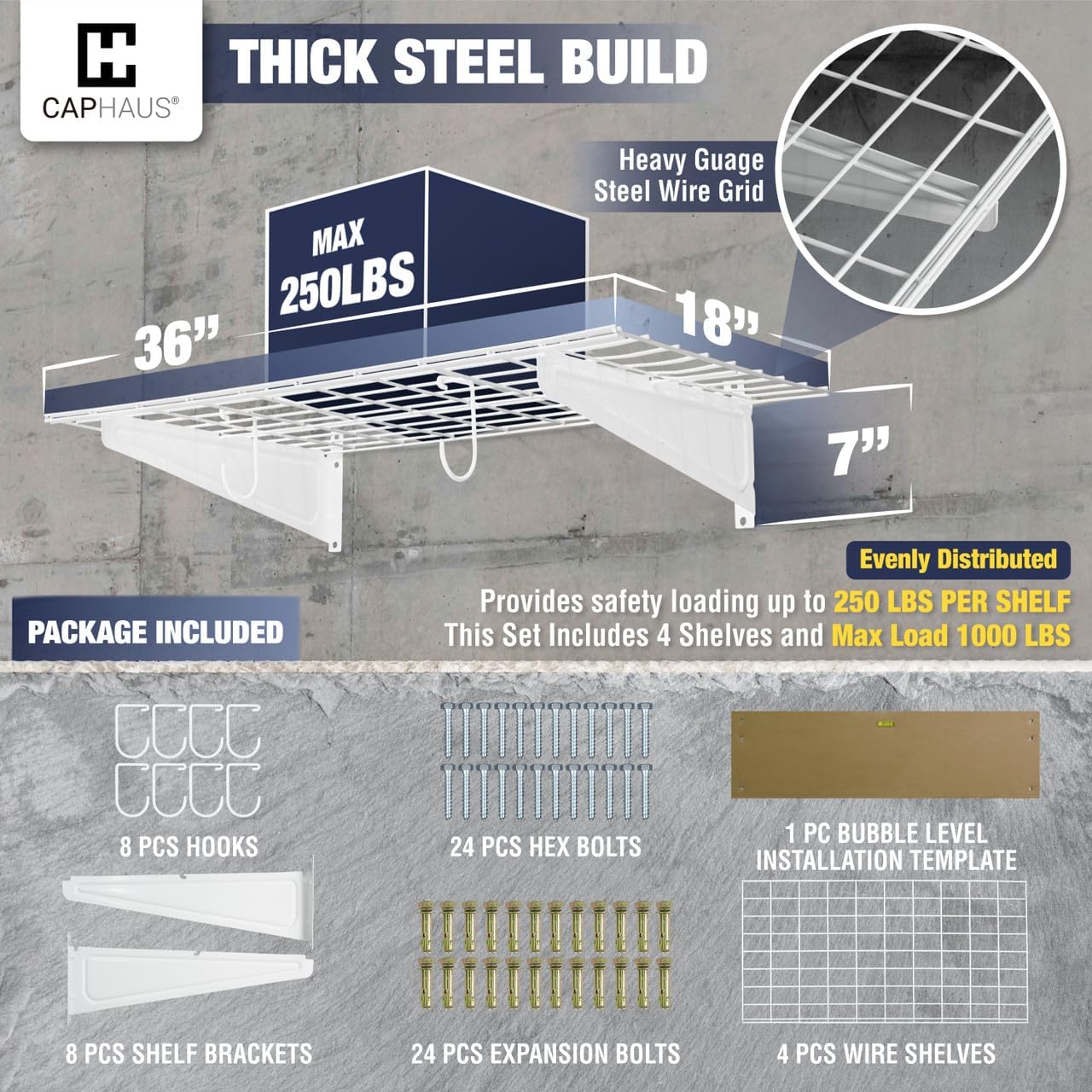 - šØ Various Size Choices - This option includes FOUR wall shelves, EIGHT Versatile hooks, and all necessary hardware. Each shelf measures 36 inches in width and 18 inches in depth, providing a total of 144 inches in width. Opt for the silver hex bolt for concrete and wooden walls and choose the golden expansion bolt for secure installation on brick walls. Heavy gauge steel construction provides safety loading up to 250lbs total per shelf, this set providing a total weight capacity of 1000 lbs.