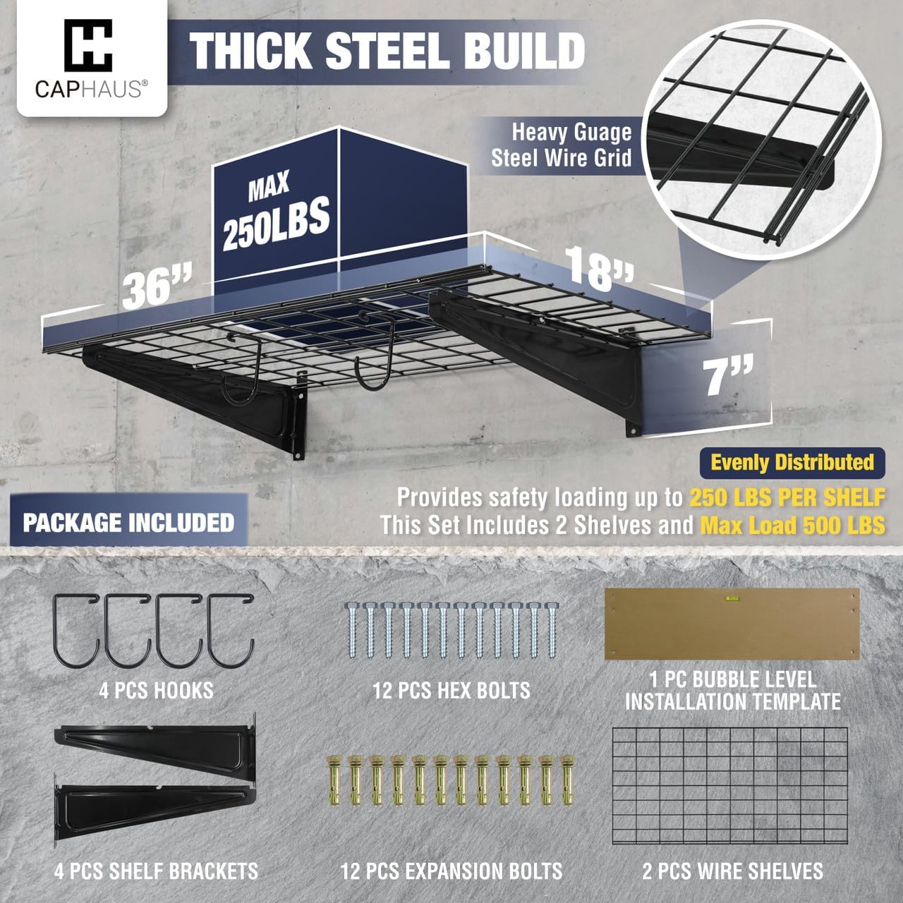 CAPHAUS 2-Pack Garage Shelving Wall Mounted 36x18 Inch, Heavy Duty Metal Wall Shelves with 4 Bike Hooks, 500lbs Capacity Storage Rack for Garage Organization System, Black