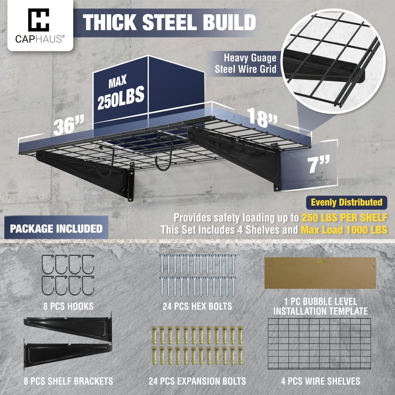 - šØ Various Size Choices - This option includes FOUR wall shelves, EIGHT Versatile hooks, and all necessary hardware. Each shelf measures 36 inches in width and 18 inches in depth, providing a total of 144 inches in width. Opt for the silver hex bolt for concrete and wooden walls and choose the golden expansion bolt for secure installation on brick walls. Heavy gauge steel construction provides safety loading up to 250lbs total per shelf, this set providing a total weight capacity of 1000 lbs.