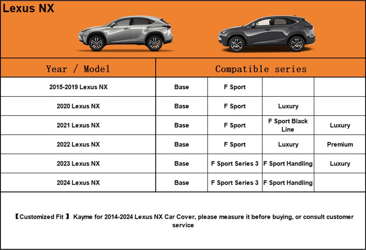 - ăSuitable forăâ Custom fit for Lexus NX (2009-2025). Come with a large enough portable bag to store your cover when you do not use