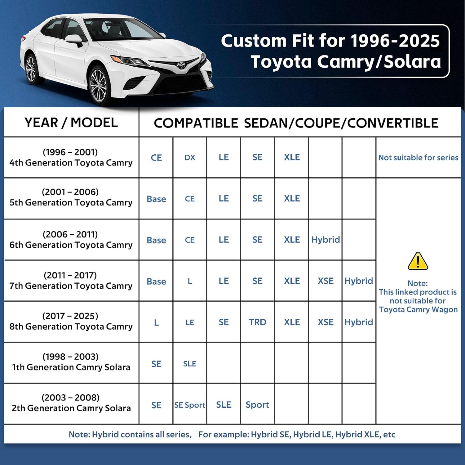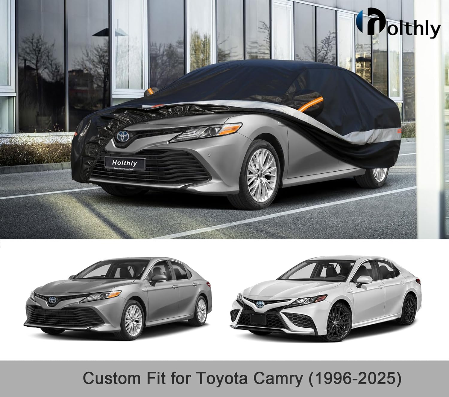 - ăPerfect Fităâ Holthly has conducted experiments to obtain a customized car cover specifically designed for Toyota Camry (1996-2025). The custom-like fit of the full cover not only enhances the -aesthetics of your vehicle but also provides superior wind resistance, thereby prolonging the lifespan of the hood. It offers enhanced and long-lasting protection for your car.