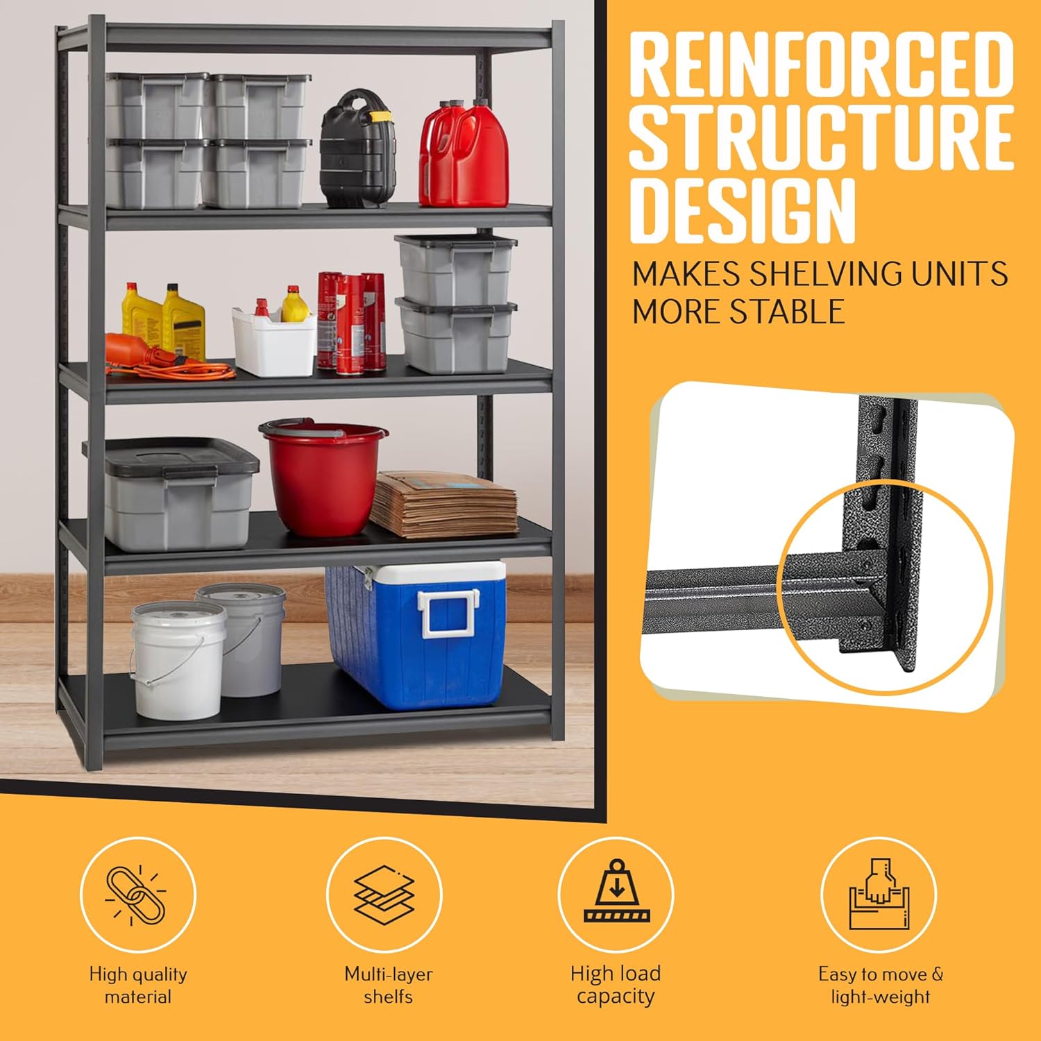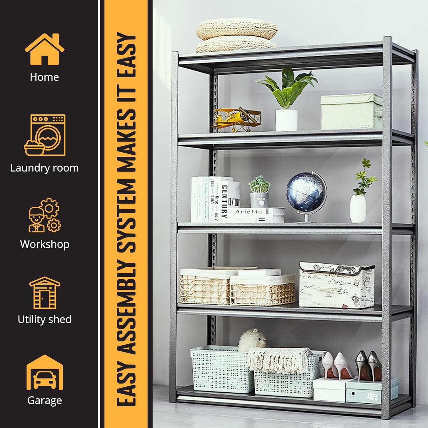 - ā MULTIPURPOSE SHELVES - The heavy-duty steel shelving unit can be used in many places such as your garage, kitchen, offices, warehouses, yard, living room, pantry, bedroom, basement, shed, workplace, and much more. It can also be used for many occasions such as storing your accessories, boxes, products, tools, organizers, books, cases, and much more!