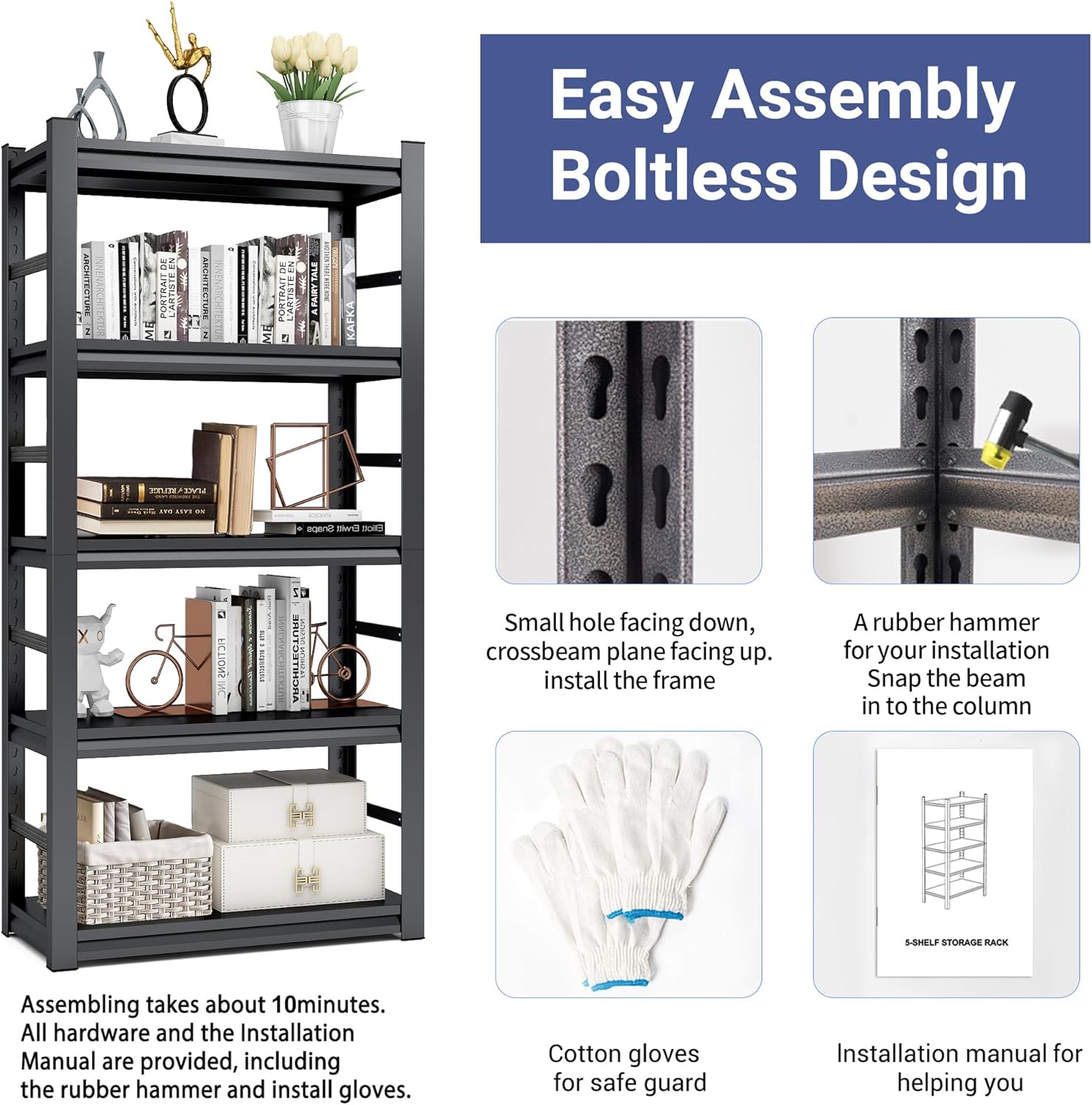 - ăHeavy Duty 5-Tier Storage Shelving Unită: Our garage storage shelves are made of solid & quality metal, which is more sturdy and tough than normal storage shelves. Featured with powder-coated smooth metal frame, this 5-tier shelving unit is corrosion and rust-resistant, can be sturdy and stable enough for long time using to organize heavy-duty stuff.