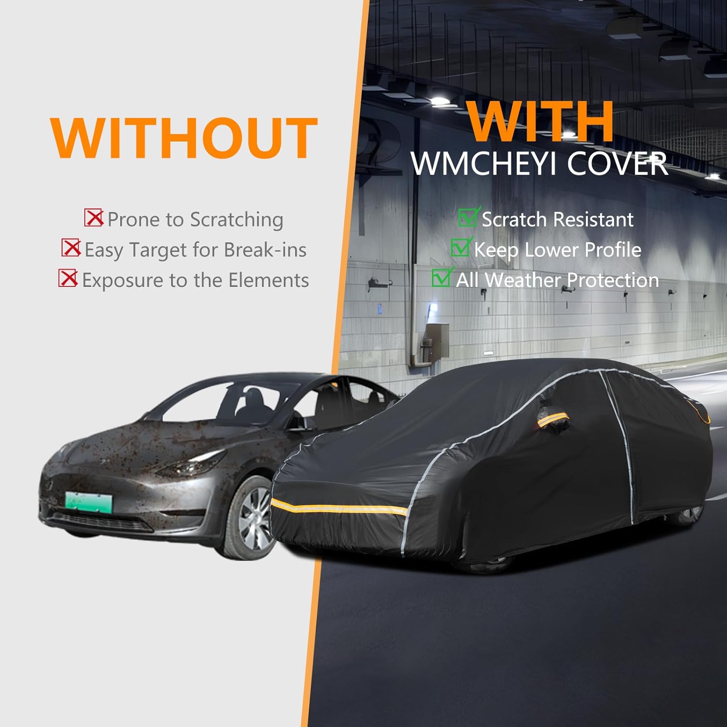 - Premium Material: WMCHEYI Tesla Model Y cover is made of 6 layers of heavy-duty premium quality material, including non-woven fabric, PE, EVA, and soft lining. Features breathable, durable, and water resistant with a dual outer shell that provides UV protection