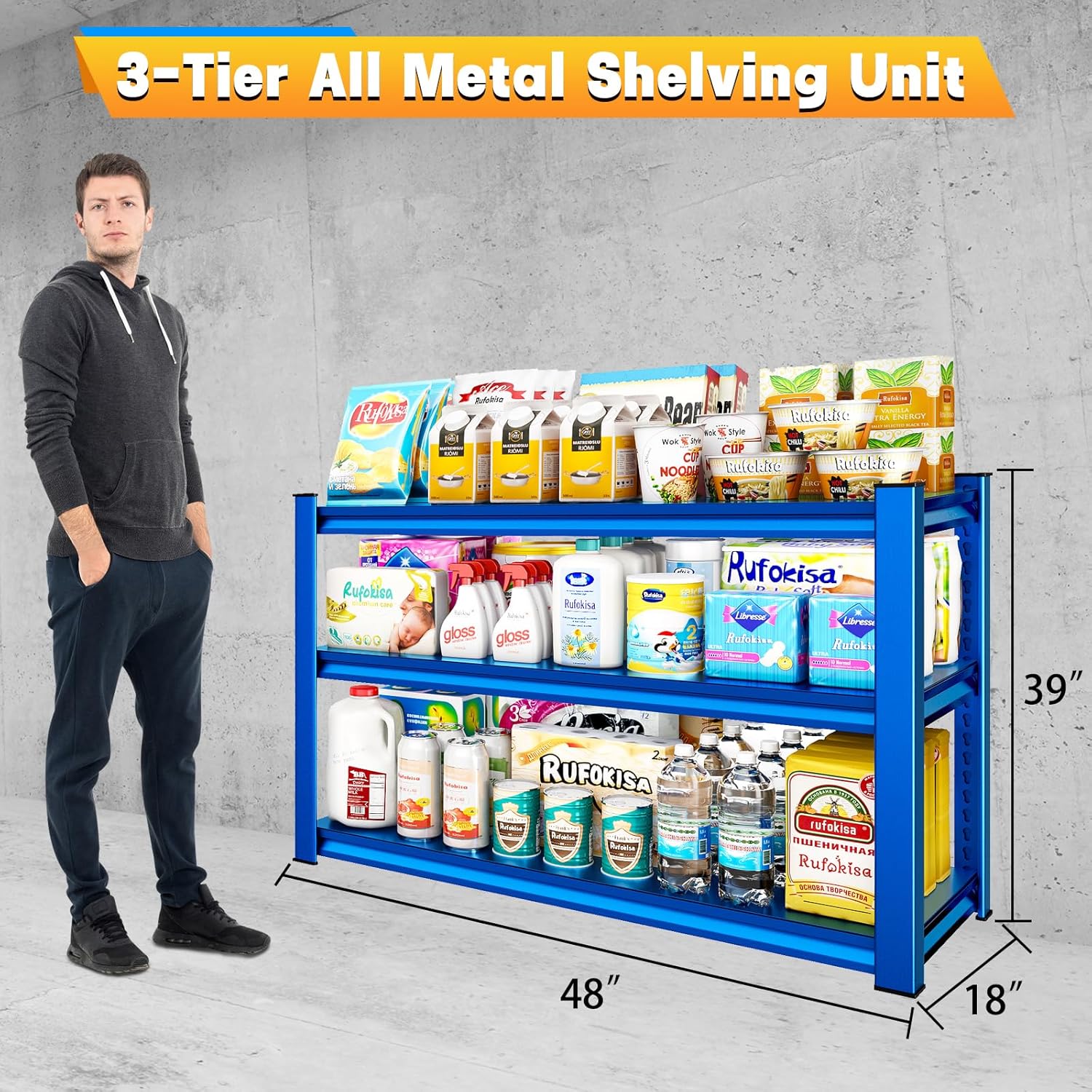 - ✅【Large Size Storage Shelves】Rufokisa 3-tier metal shelving unit with size of 48"W*18"D*39"H,which provides sufficient storage space and holds tons of items. It will works perfect for your garages, warehouses, basements,kitchens, pantry, basement etc .