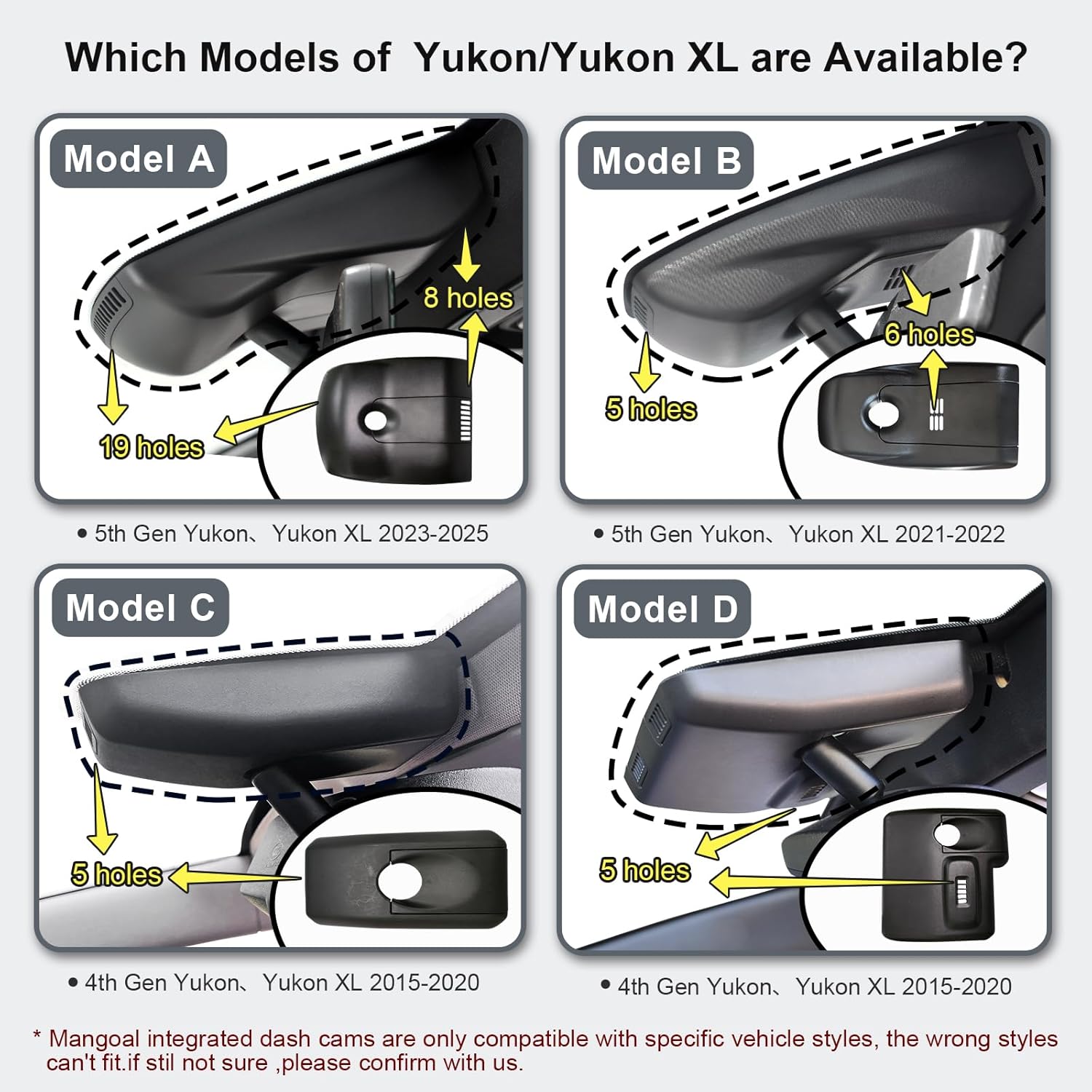 - ăCustom fit for GMC YukonăMangoal 4k dash cam can fit perfectly behind the rear view mirror like original. No messy wiring exposed, no complicated rewire at all. Perfectly intergrated with GMC Yukon, Yukon XL 2015 2016 2017 2018 2019 2020 (Model D), Such as SLE SLT Denali.
