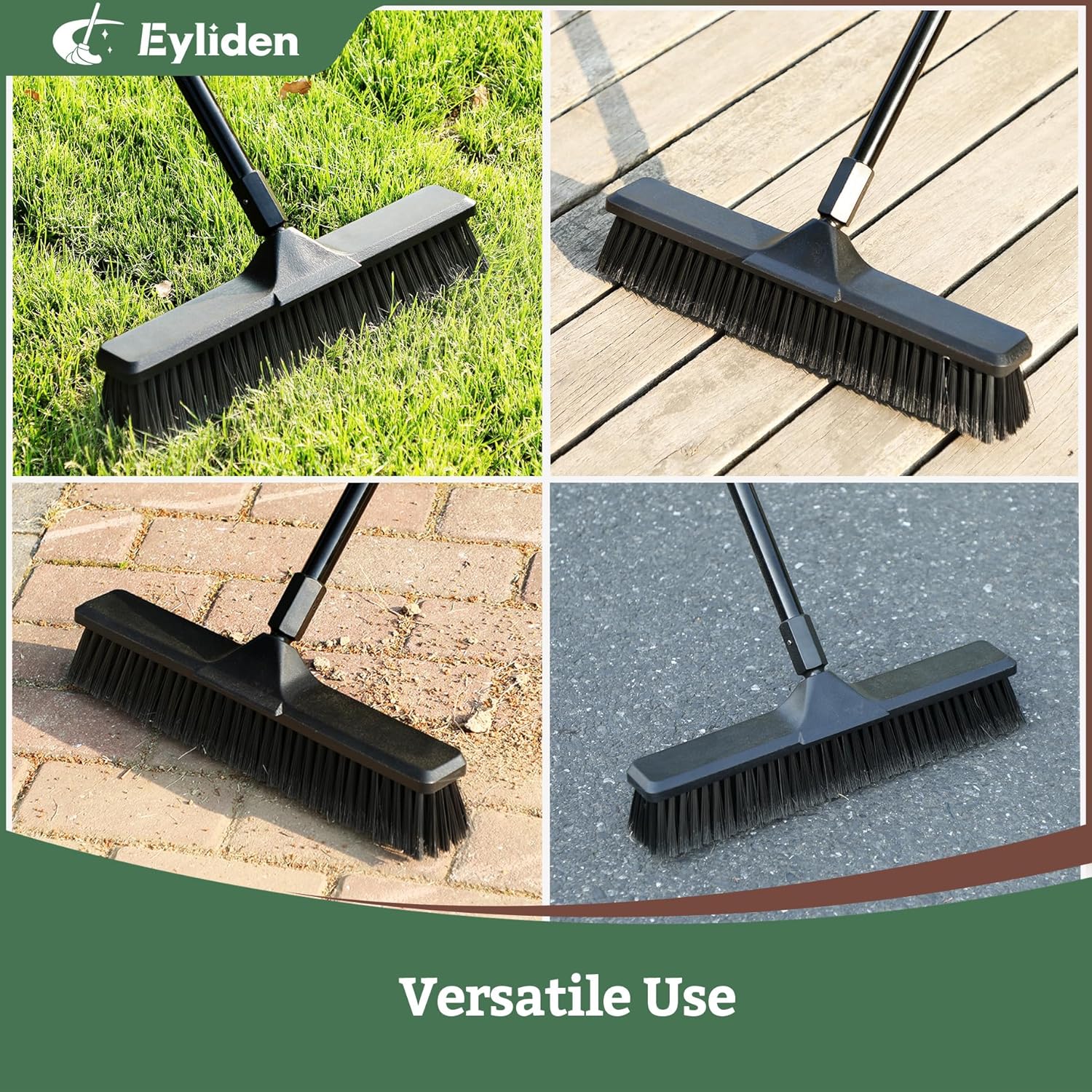 - 【Versatile Use Heavy Duty Push Broom】The width of the sweeper broom head is about 18 inch, so Eyliden broom can sweep a large area at a time. Our push broom/brush for outdoor All Types of Indoor, Outdoor, Garage, Shop, Sidewalk, Patio, Deck, Backyard, Garden, Lawn, Concrete, And Other Multi Surface To Sweep Away Debris, Like Stones, Leaves, Grass, Soil, Snow, Gravel And All Kind of Floor Cleaning