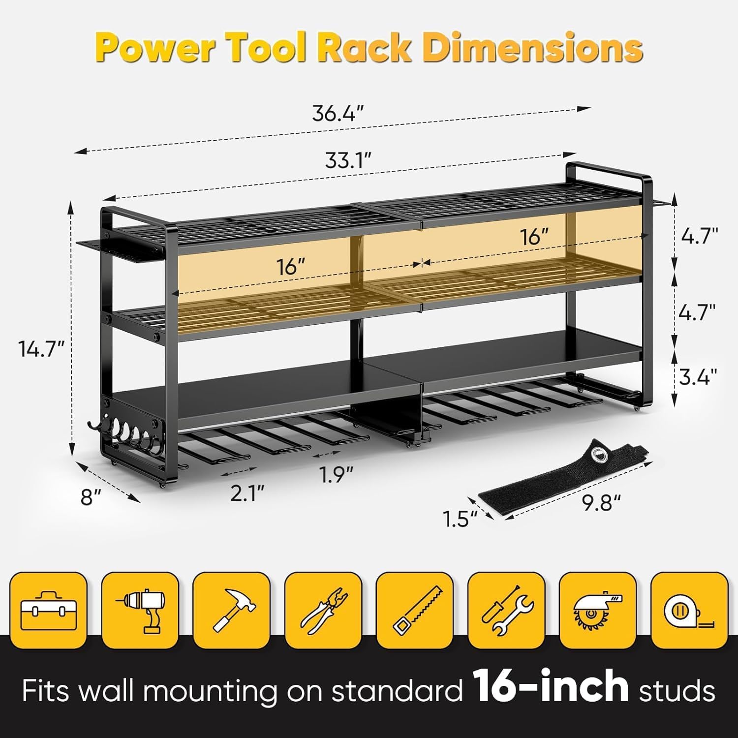 - Four Layers of Large-Capacity Tool Racks: Our upgraded drill stand, measuring 36.4 x 11.7 x 8 inches, is both taller and wider than traditional tool racks. The top three layers are designed to accommodate heavy tools, such as toolboxes, charging stations, and large power tools. The bottom layer can hold up to eight cordless drills, while the side racks feature designated spaces for a hammer, pliers, and screwdrivers.