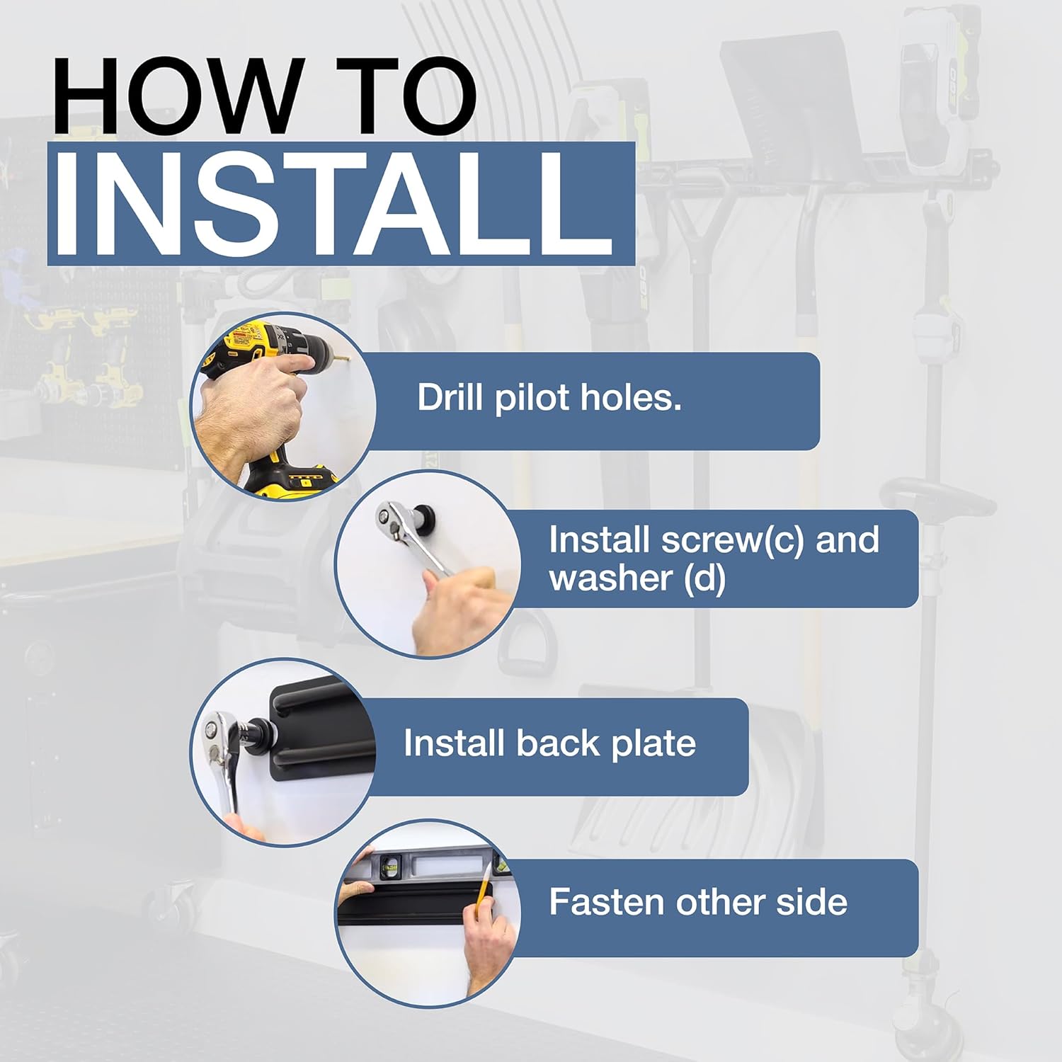- 64" modular garage tool organizer: This adjustable garage tool organizer wall mount is designed to hold garden tools, shovels, rakes, brooms, power tools, and more. Perfect for garage organization and storage, sheds, and utility rooms.