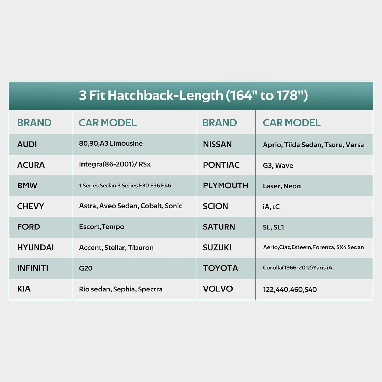 - ăCHOOSE THE RIGHT MODELă: Molebt car cover fits for hatchback 164 to179 inch. For example Mazda 3 hatchback, Honda Civic Hatchback, Toyota Corolla Hatchback, Subaru Impreza Hatchback, Ford Fiesta, Volkswagen Golf/GTI, Hyundai Kona, Nissan Leaf, Chevrolet HHR, Chrysler PT Cruiser, Fiat 500X/500L, Kia Forte5, Mini Clubman etc.