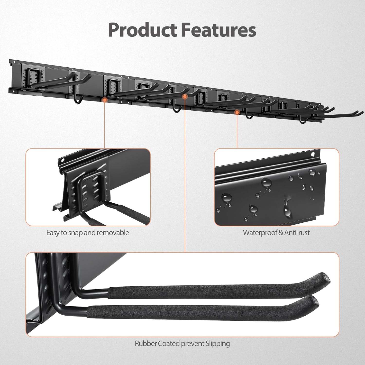 • HEAVY DUTY GARAGE WALL ORGANIZER: Crafted from solid steel and coated with durable black powder, our wall-mounted storage system is built to last a lifetime while preventing rusting. Featuring rubber-coated double long hooks, it offers added protection against slippage and damage, ensuring your tools are securely stored and maintained in top condition.
