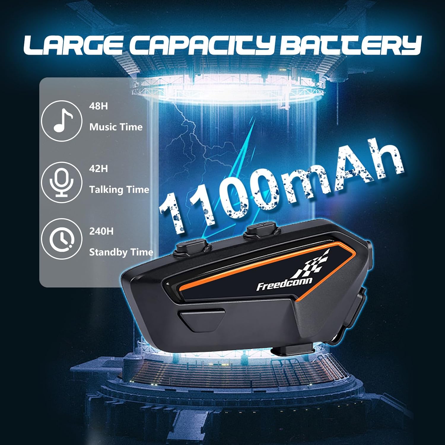 - 【Ultimate Music Journey】The FreedConn F1 motorcycle helmet Bluetooth headset is powered by a robust 1100mAh battery, offering up to 48 hours of music playback, and 50 hours talk time. Enjoy uninterrupted music and calls on the go with this reliable motorcycle helmet bluetooth headset