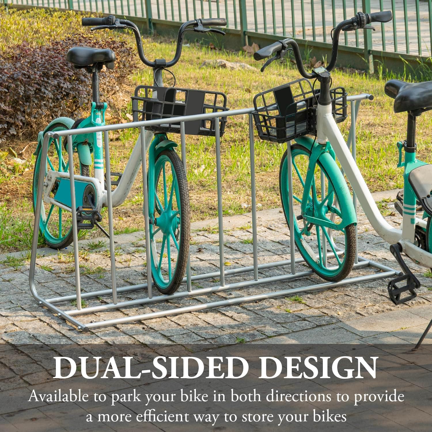 - 6-bicycle floor standing silver-toned metal holder provides dual-sided indoor or outdoor parking for bikes **Some assembly required**