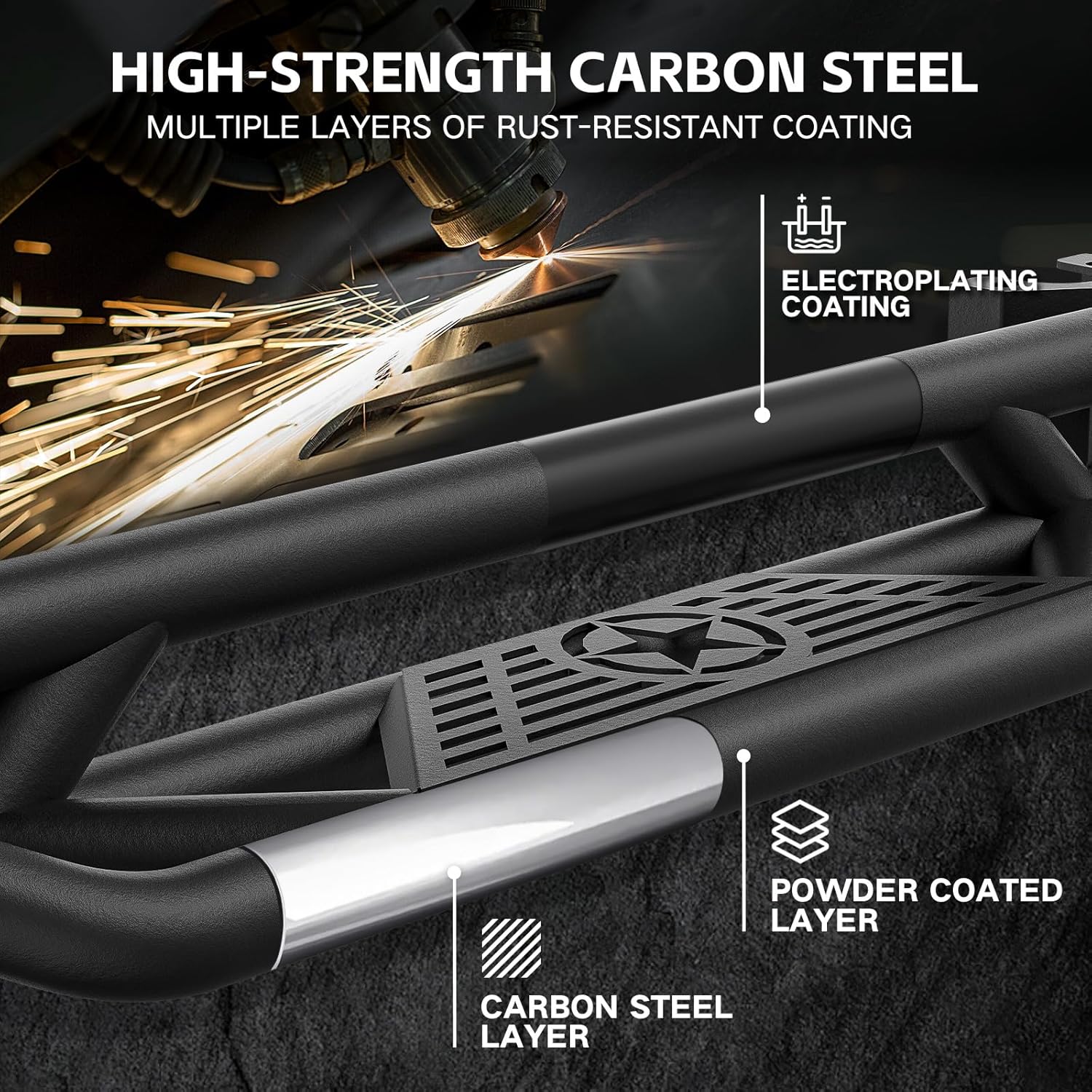 - 【Stylish Design】: Featuring a step-style design with a drop height of approximately 5 inches. The rugged off-road look is complemented by a stylish design, enhancing the appearance of your wrangler JL.
