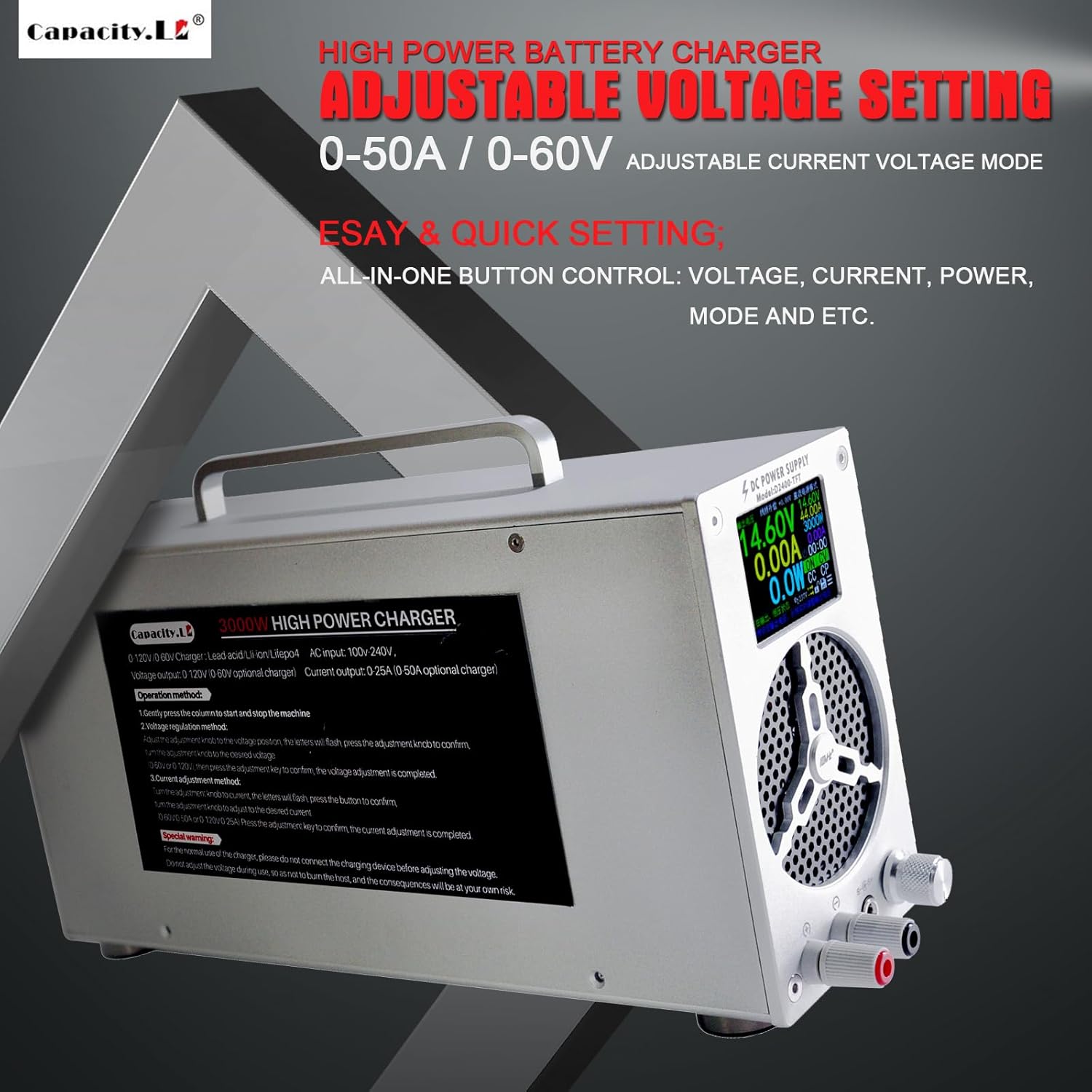 - HIGH POWER LIFEPO4 BATTERY CHARGER: Adjsutable current & voltage 0-50A / 0-60V. very suitable for large capacity LIFEPO4 battery or lithium battery charging. Intelligent circuit chip, improve charging conversion rate, stabilize discharge voltage, charge better than ordinary chargers, more durable. When charging full will auto stop.