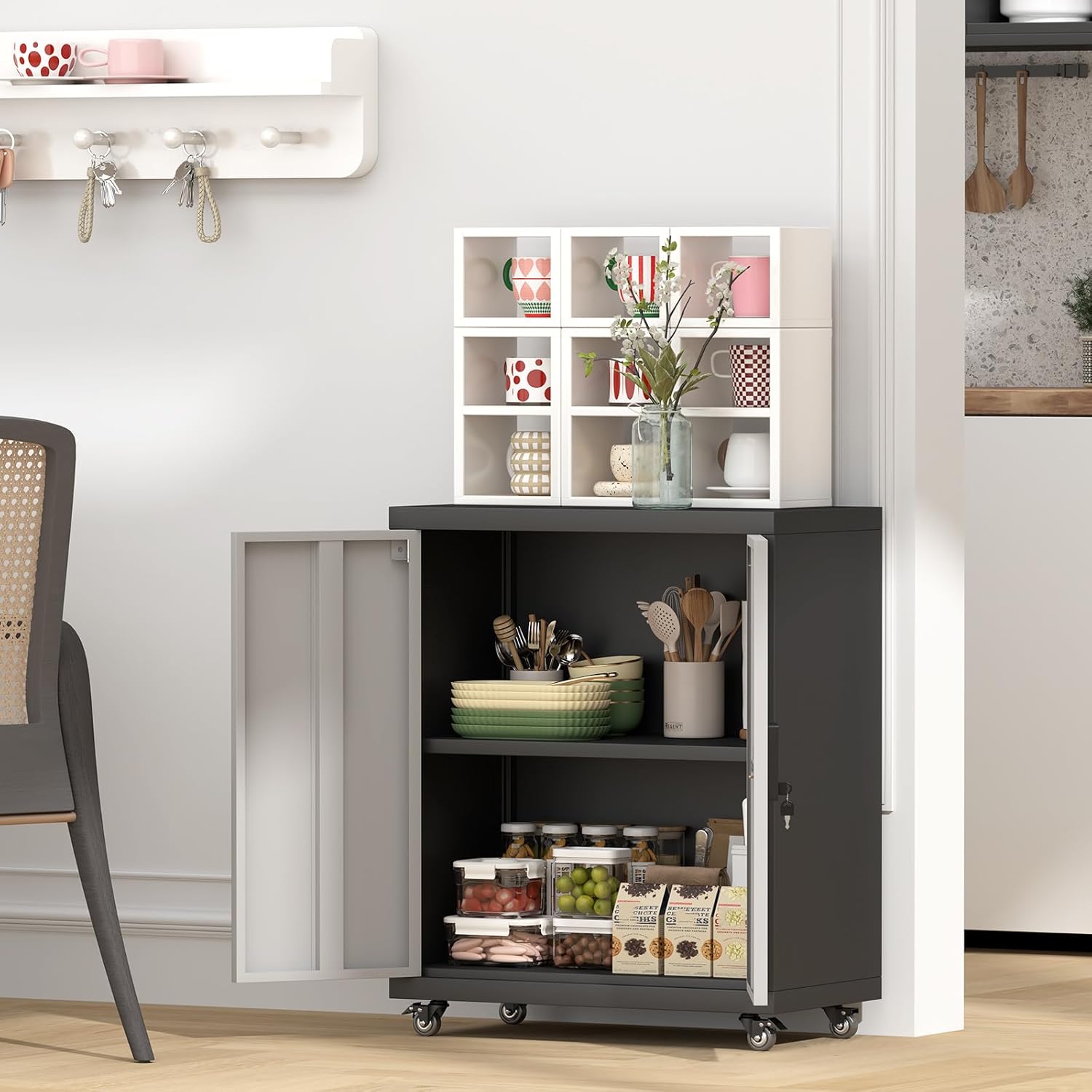 - 🔒【Lockable Door & Adjustable Shelf】This lockable storage cabinet with wheels features two doors and an adjustable shelf. The lockable doors provide a secure place for your personal items and documents. The adjustable shelf offers more options for storing items of different sizes.