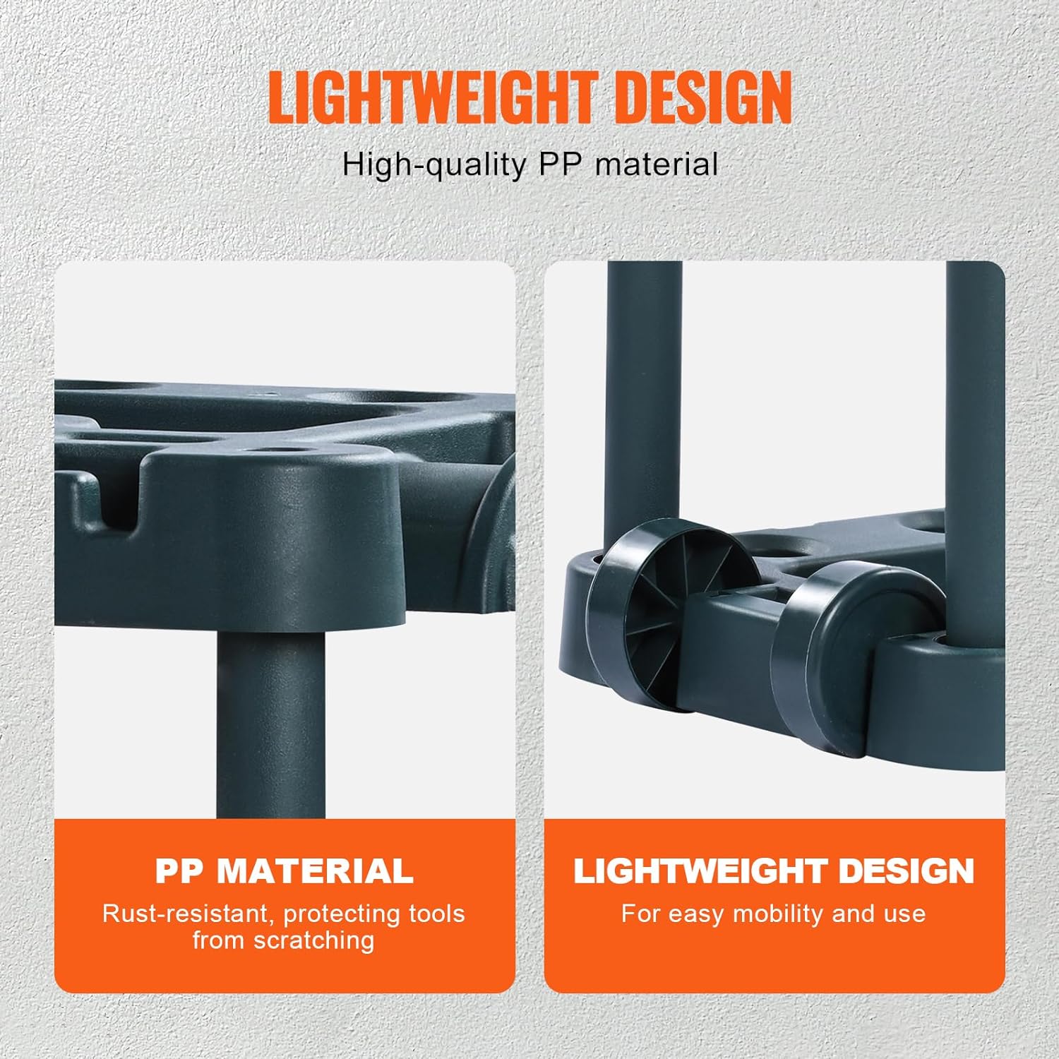 - Built to Last: Crafted from top-quality PP (Polypropylene) material, this lawn tool organizer is tough against the elements and wear. It weighs just 7.17 pounds (3.25 kg) with all parts included. The sturdy vertical pipes enhance stability and load-bearing capacity, making it easy to move while staying rock-solid.