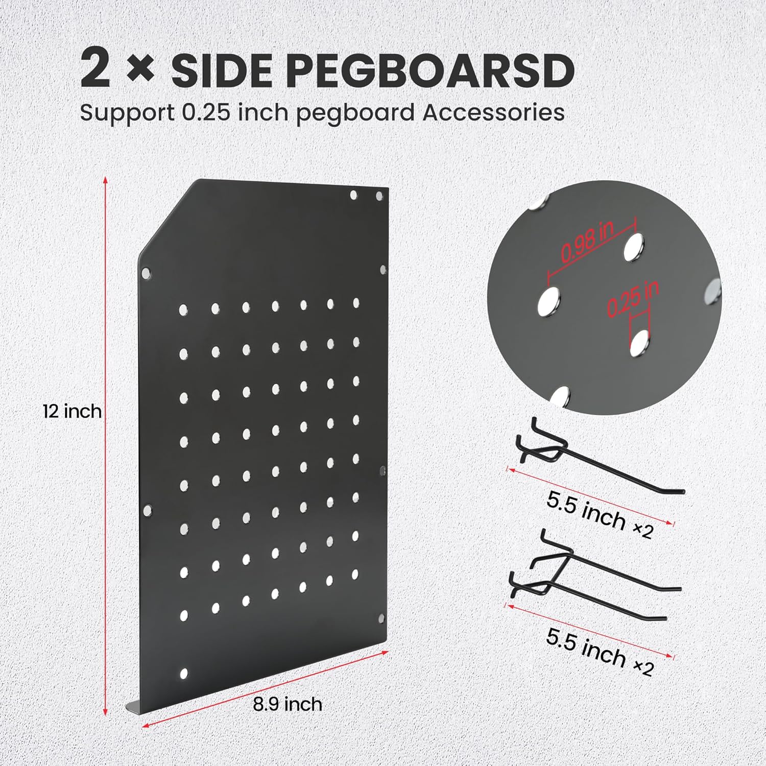 - Versatile Side Pegboards: Hang garage tools on 8.9"W × 12"L side pegboards with included long hooks, drill bit rack, and cordless rack, supports 0.25" pegboard organizer accessories for DIY customization