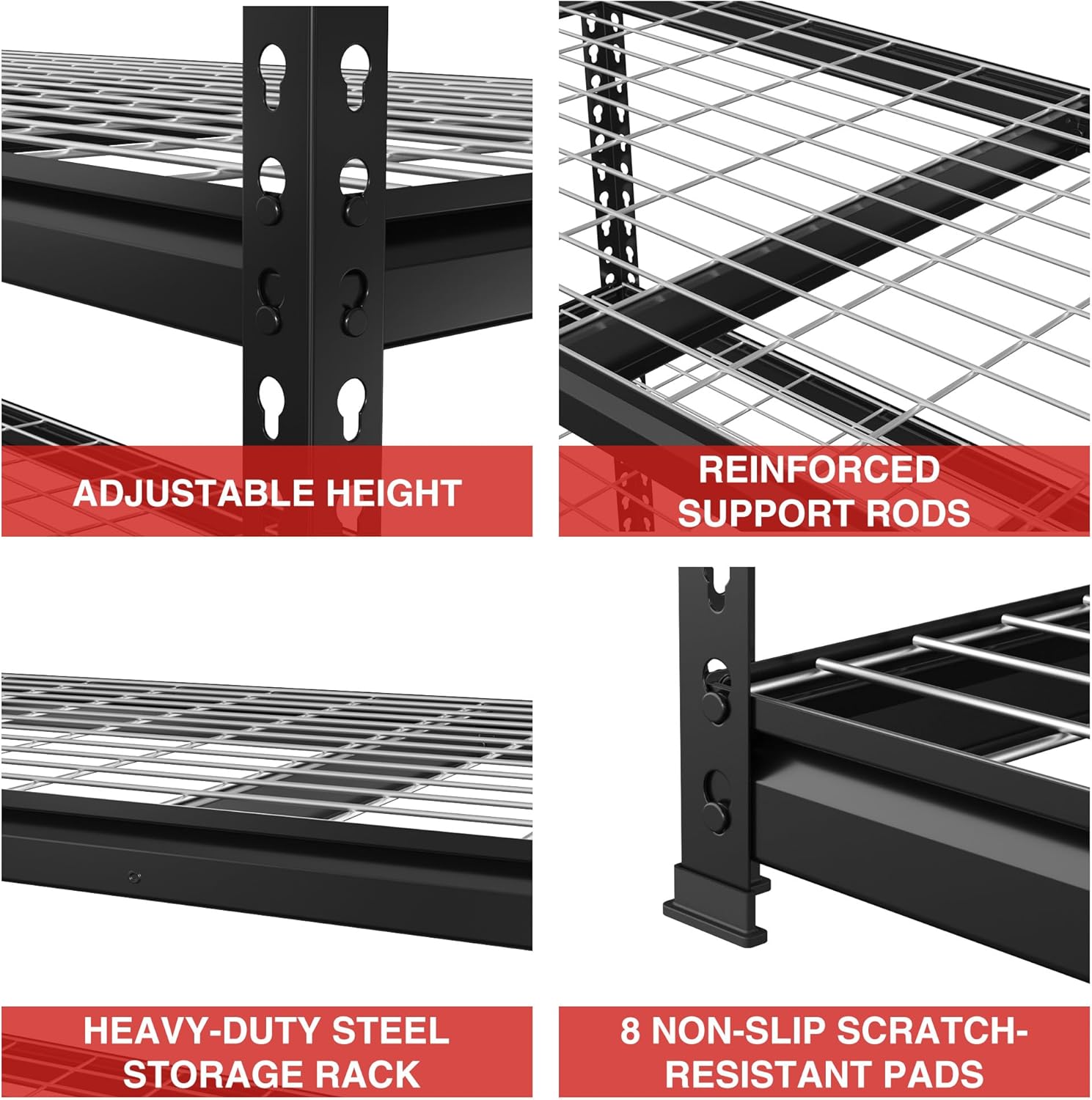 - 【Boltless Shelving】No nuts or bolts are required, you can assemble this shelving unit easily and quickly. A rubber mallet is recommended for assembly to tighten the shelving rack. This shelving is equipped with rubber footpads, which can protect the floor, add extra stability and avoid the shelving sliding accidentally.