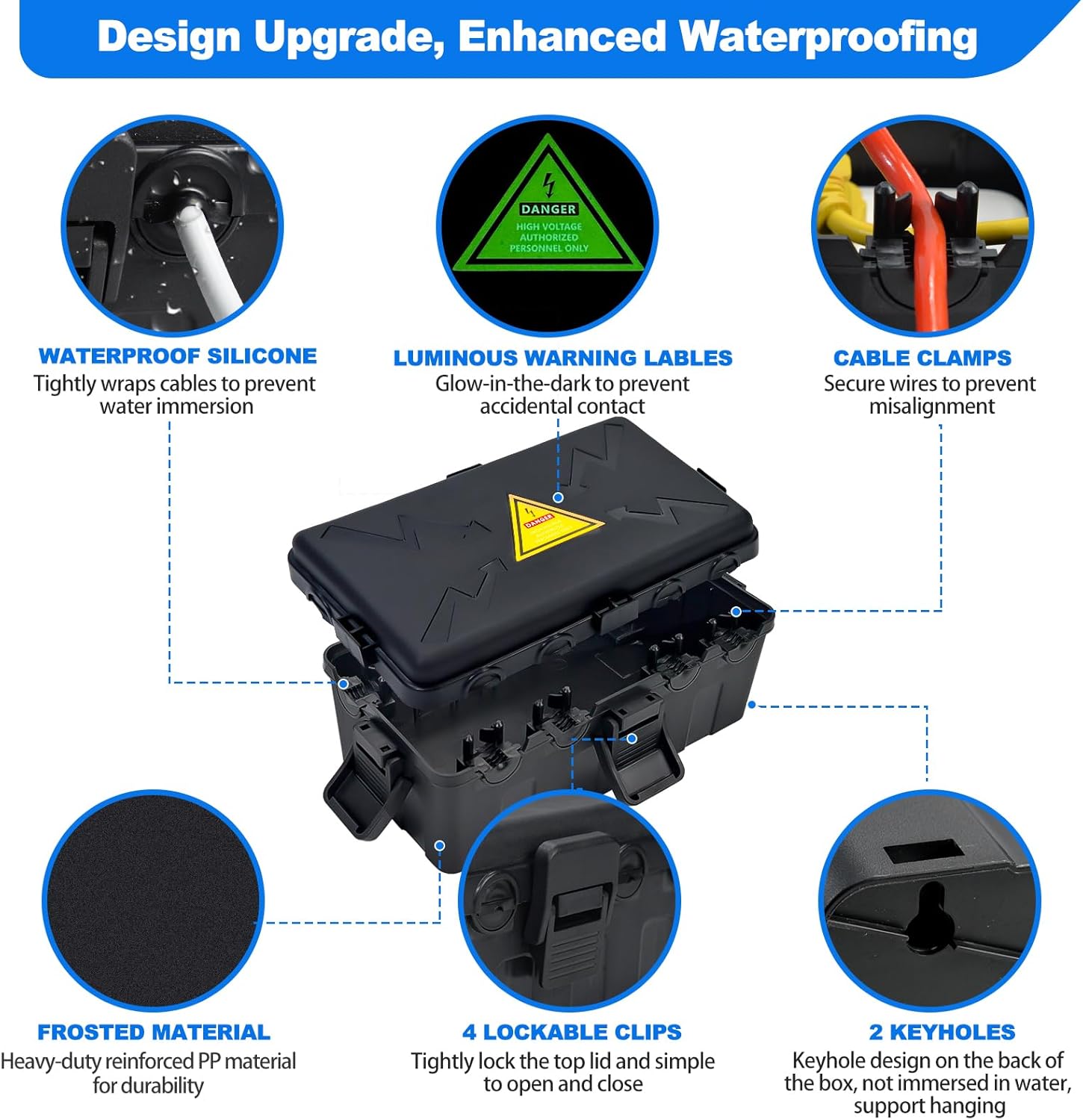 - LUMINOUS SAFETY WARNING LABEL: the lid of the outdoor electrical box has a luminous warning label that glows at night to prevent accidentally touching it, ensuring the safety of your family and pets.