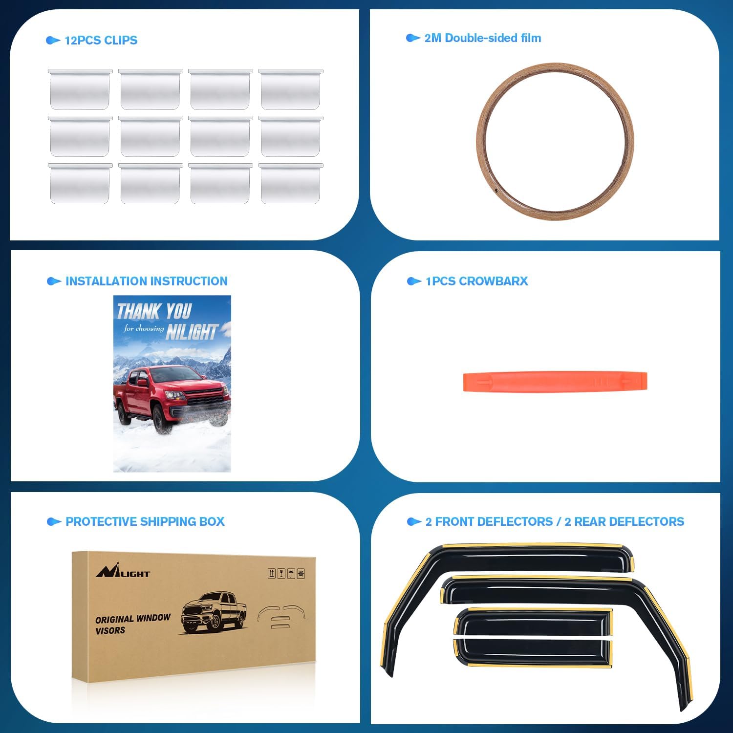 - QUICK AND EASY INSTALL: Nilight Wind Deflectors provides perfect fit for your Car. Just slip it onto your carβs window and your job is done within minutes. There is no drilling or no tools required.
